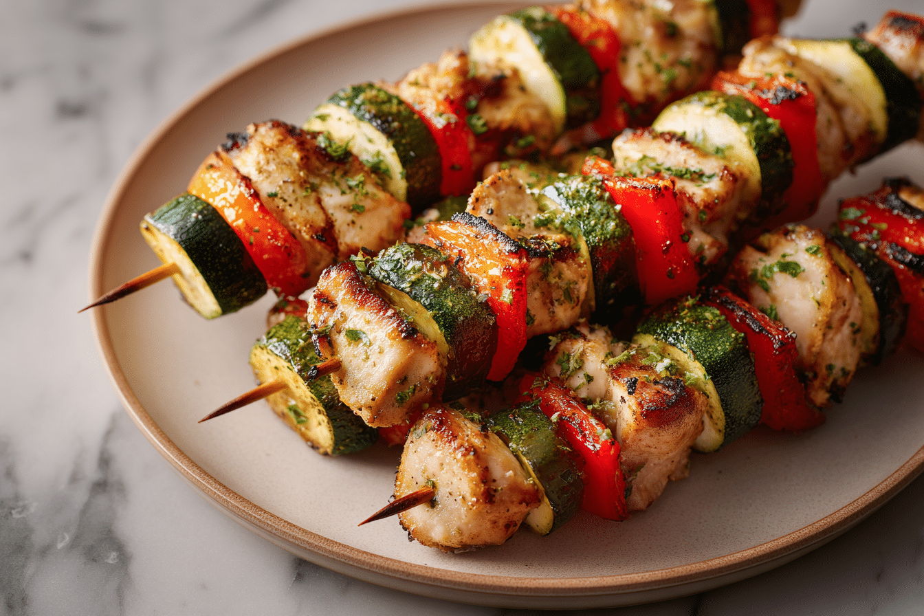 Cook the skewers for 10–12 minutes, turning halfway through. The chicken should reach an internal temperature of 165°F and have lightly browned edges.