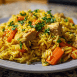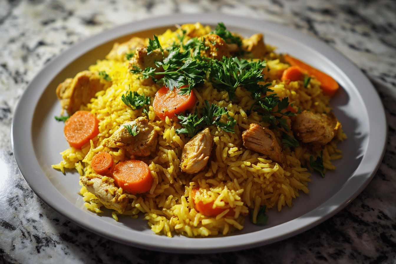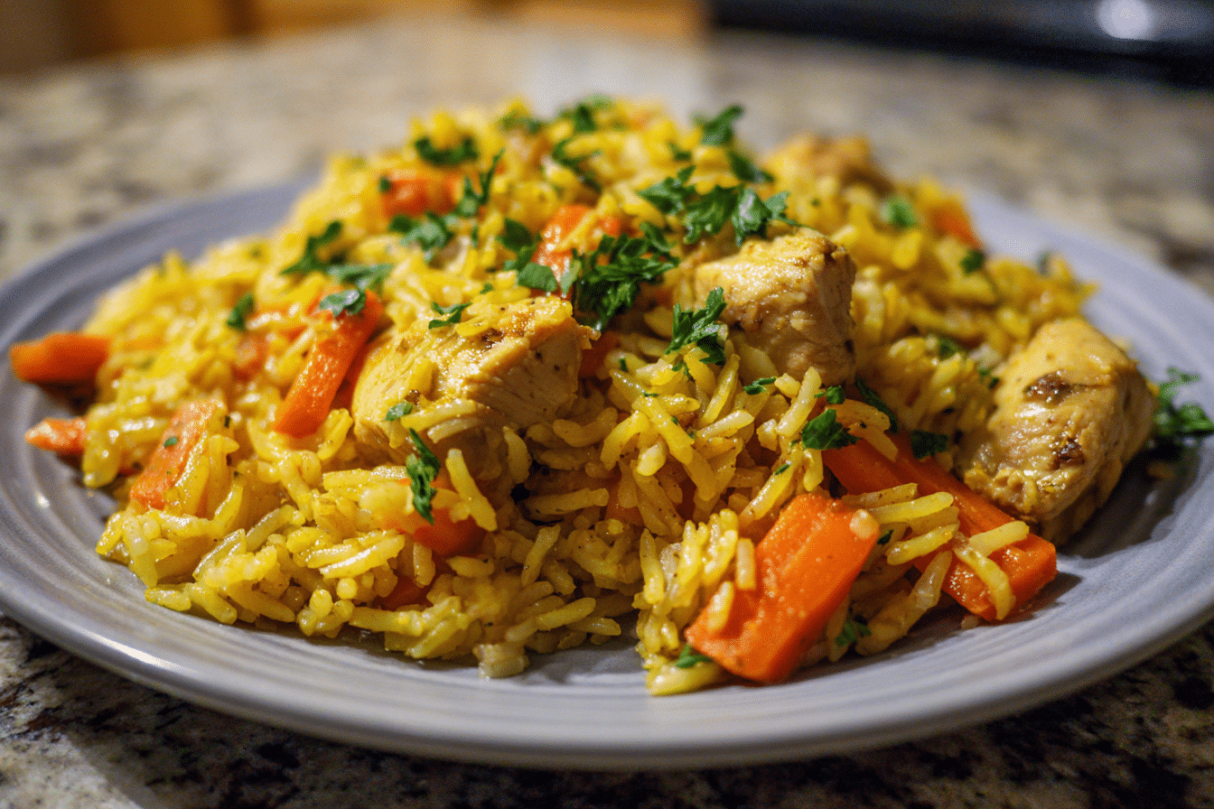 A warm and nourishing rice dish made with turmeric, tender chicken, and simple spices for a balanced and comforting meal.