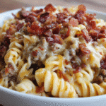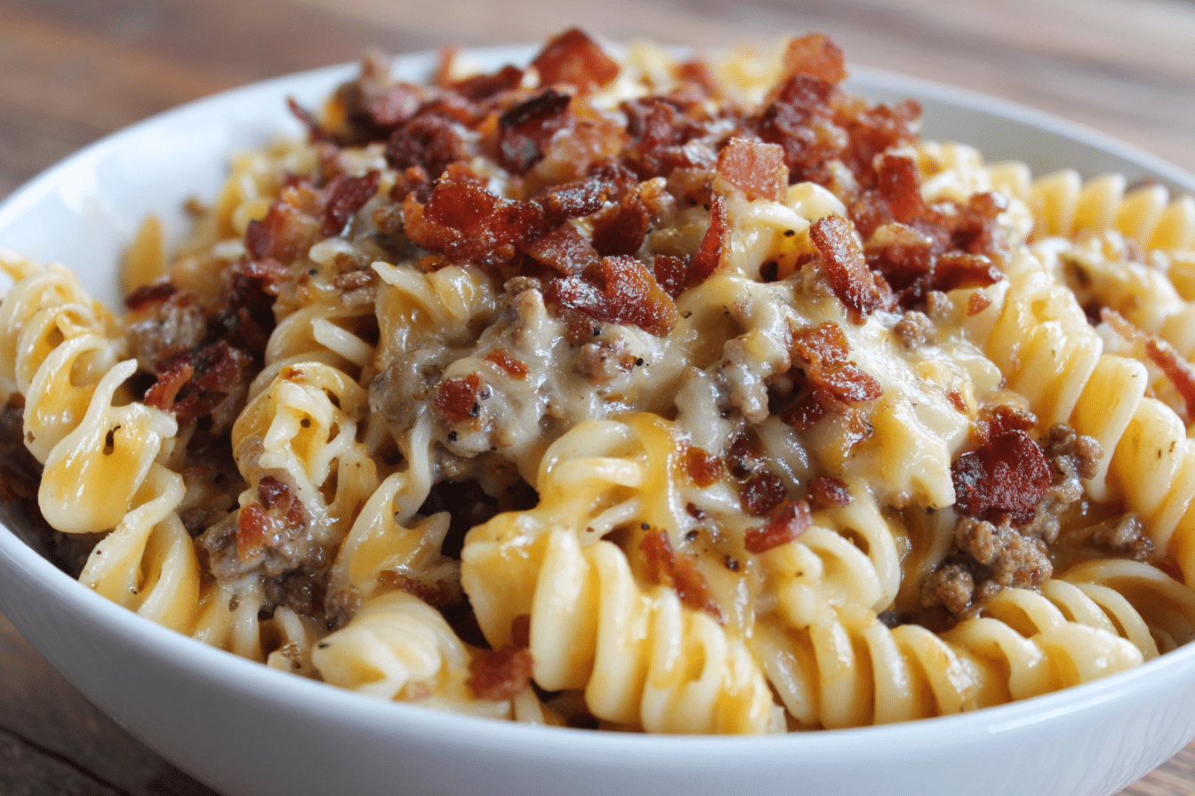 This bacon cheeseburger pasta combines savory beef, crispy bacon, melty cheddar, and tender noodles in a creamy, one-pot sauce. A quick, crowd-pleasing comfort dish ready in 30 minutes.