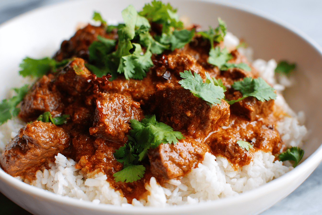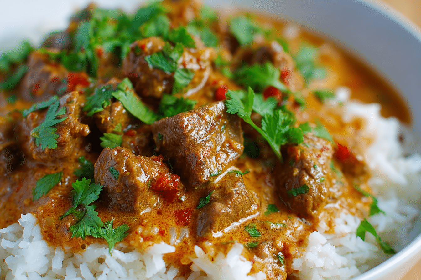A rich and hearty beef coconut curry simmered in creamy coconut milk with warm spices, tender beef, and vibrant aromatics.