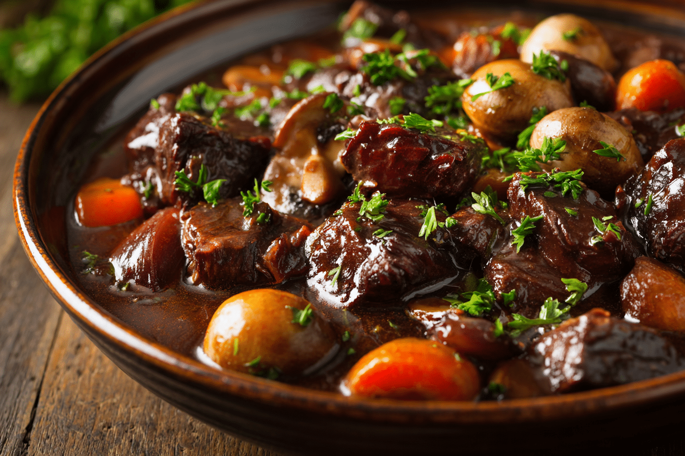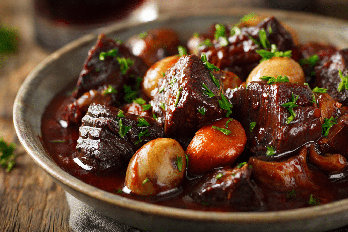 A classic French beef stew made with tender beef, red wine, and slow-cooked vegetables in a rich, savory sauce.