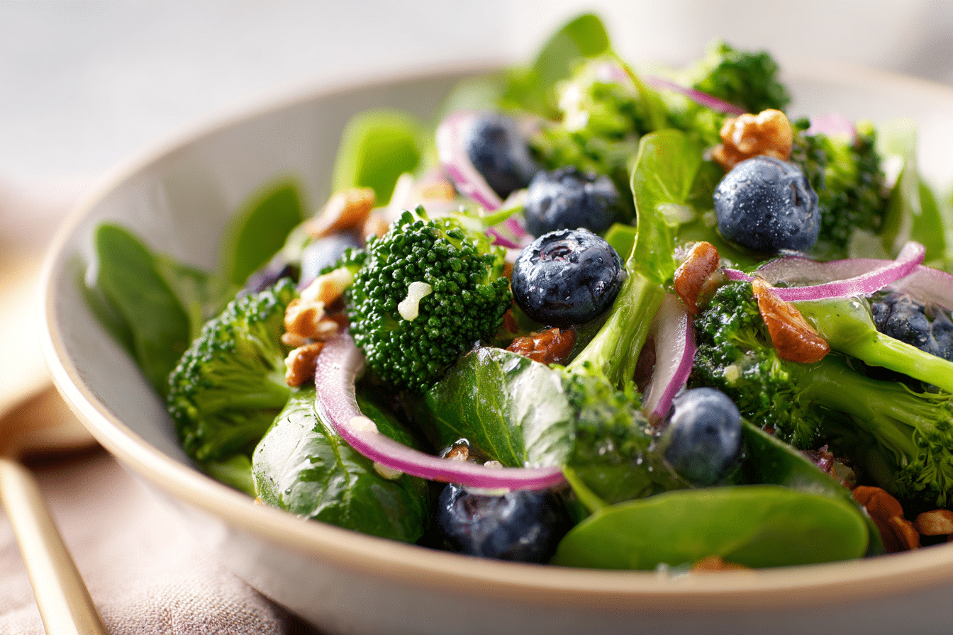 A fresh and colorful salad combining spinach, broccoli, blueberries, and a light homemade vinaigrette.
