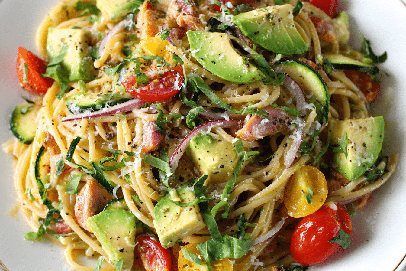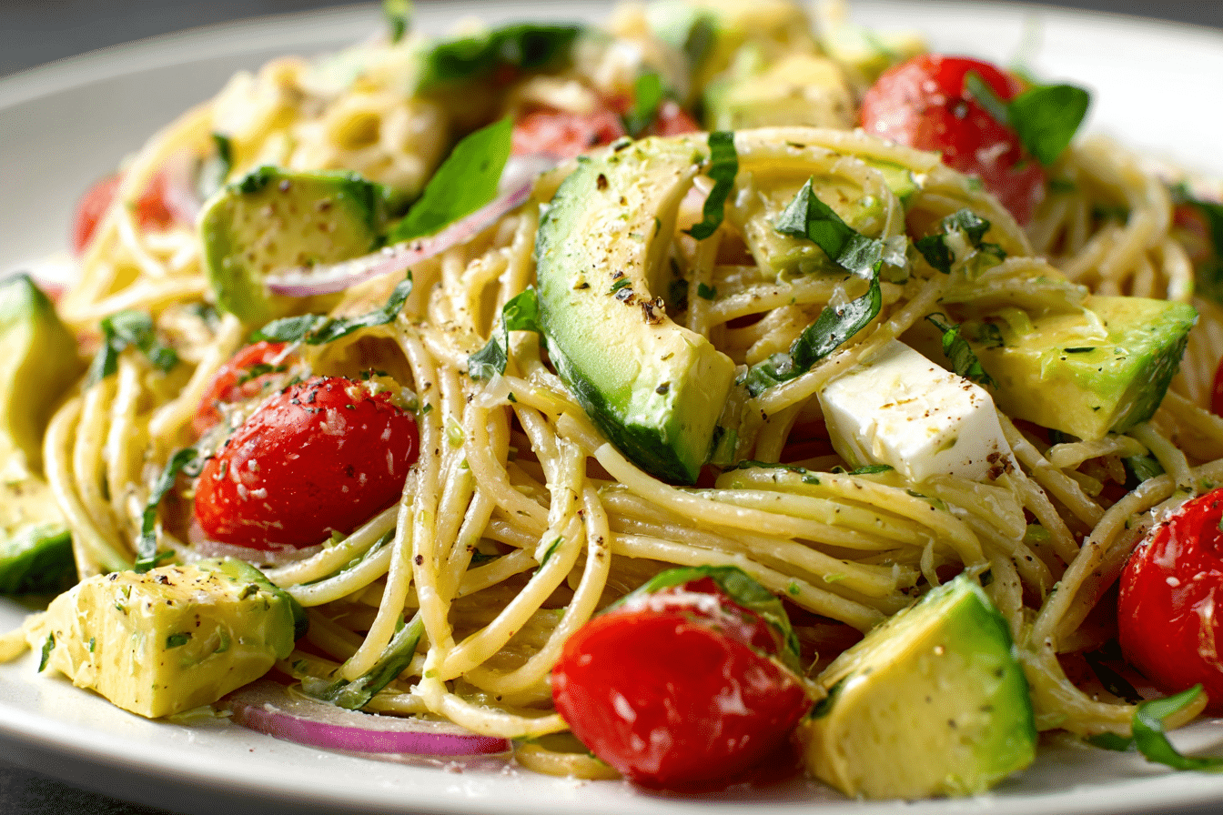 A fresh and vibrant California pasta salad with crisp vegetables, creamy avocado, and a light lemon dressing.