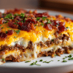 A hearty, family-style casserole layered with seasoned meatloaf, creamy mashed potatoes, and melty cheddar cheese — baked to bubbly perfection.