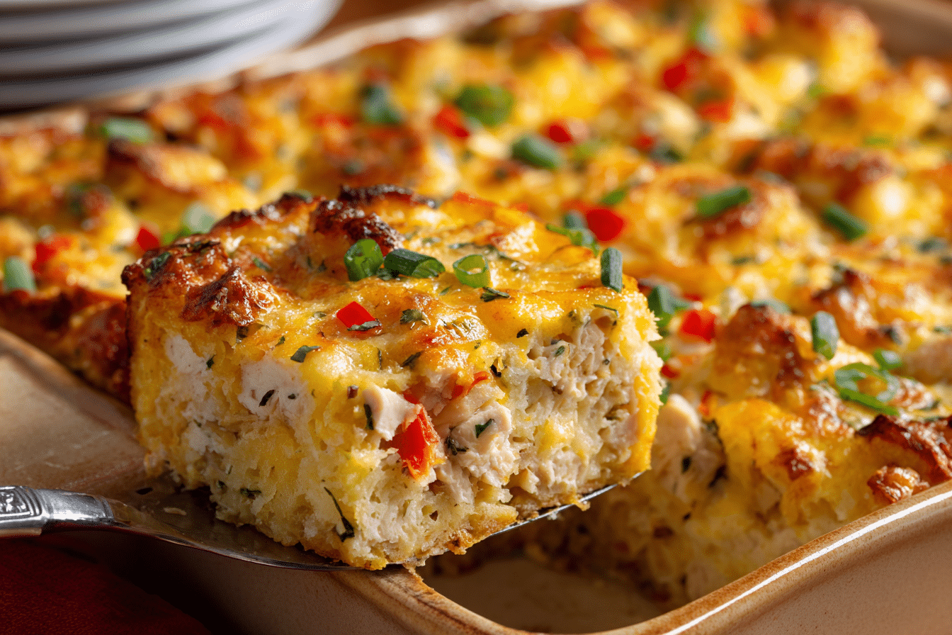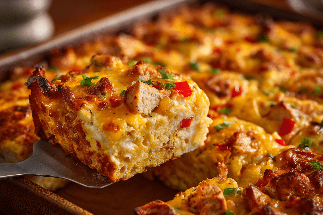 A comforting breakfast casserole filled with crispy hash browns, tender chicken, fluffy eggs, and two cheeses. Easy to prep and great for brunch or weekly meal planning.