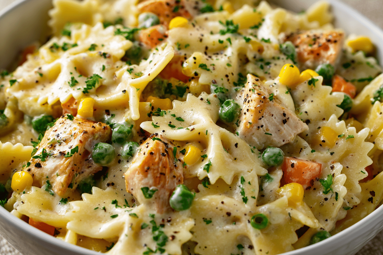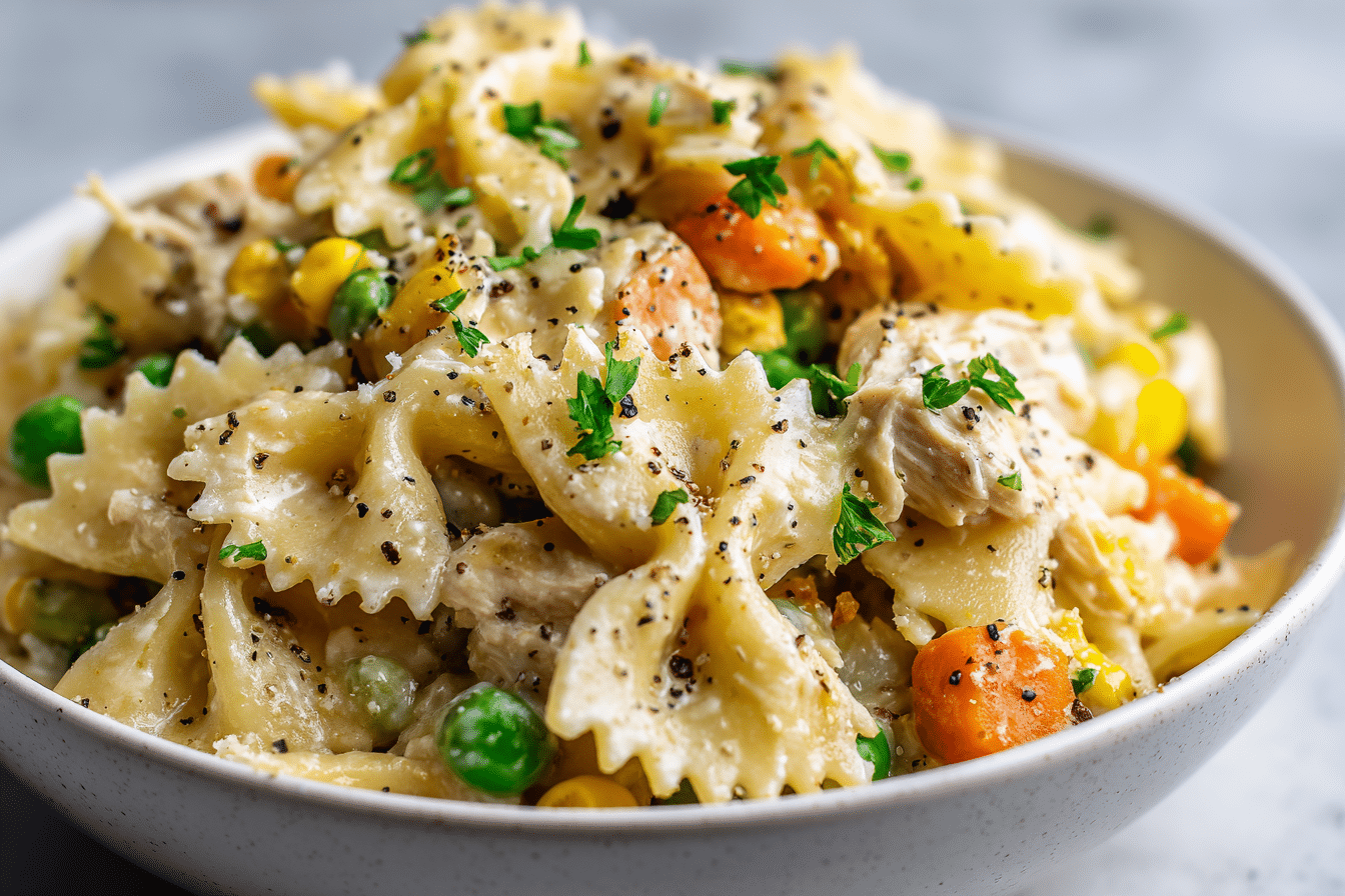 A cozy, one-pot pasta dish inspired by classic chicken pot pie. Juicy chicken, tender vegetables, and pasta in a creamy, savory sauce — no crust needed.