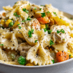 Creamy, comforting, and packed with flavor, this Chicken Pot Pie Pasta brings everything you love about the classic casserole into a quick and hearty one-pot dinner. Think tender chunks of chicken, a medley of colorful vegetables, and pasta all tossed in a rich, velvety sauce that tastes just like the filling of a traditional pot pie — no crust required.