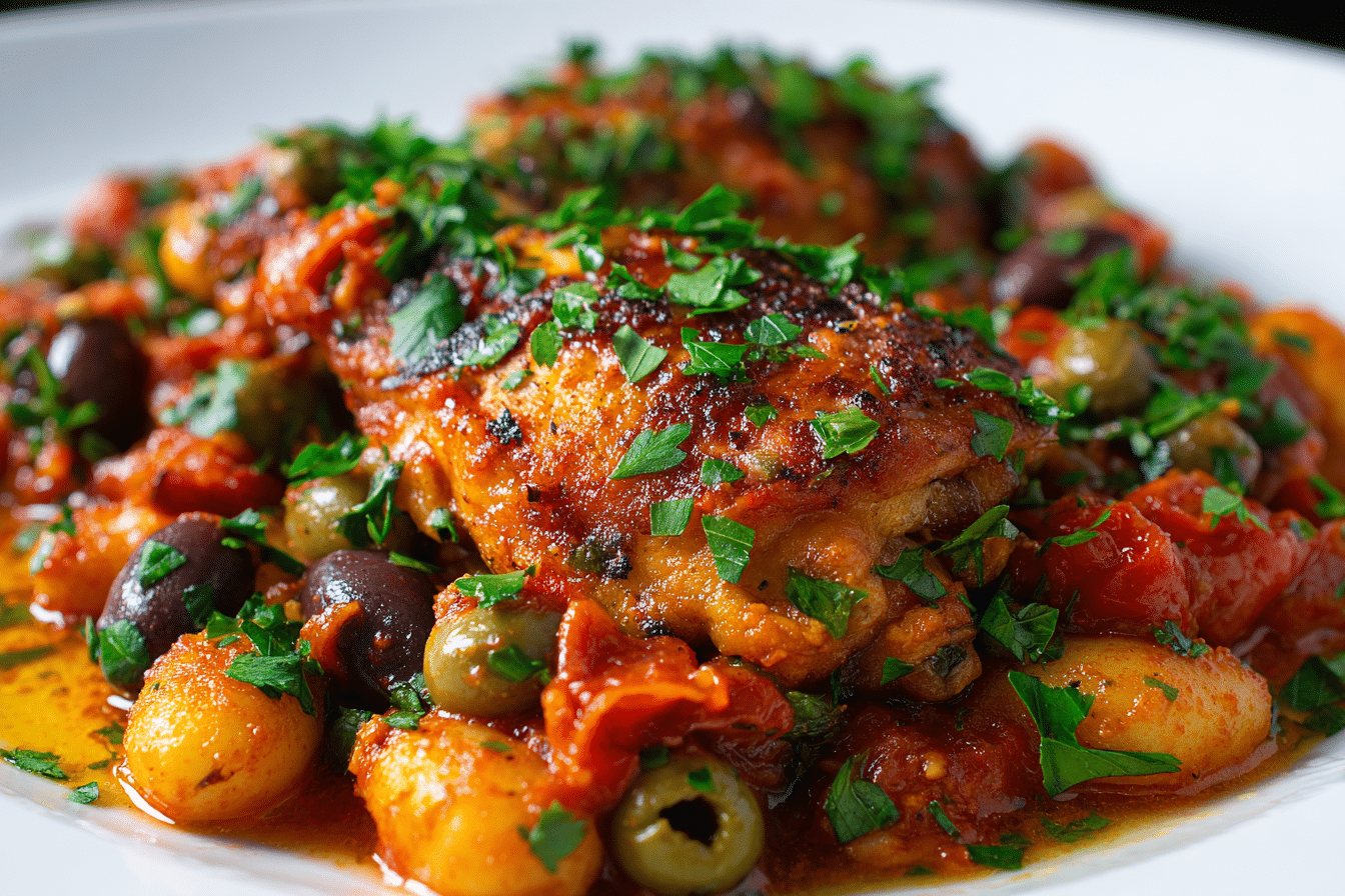 A rustic, Mediterranean-style chicken dish simmered in a bold tomato sauce with olives, capers, garlic, and anchovies. Packed with savory flavor and ready in under an hour.