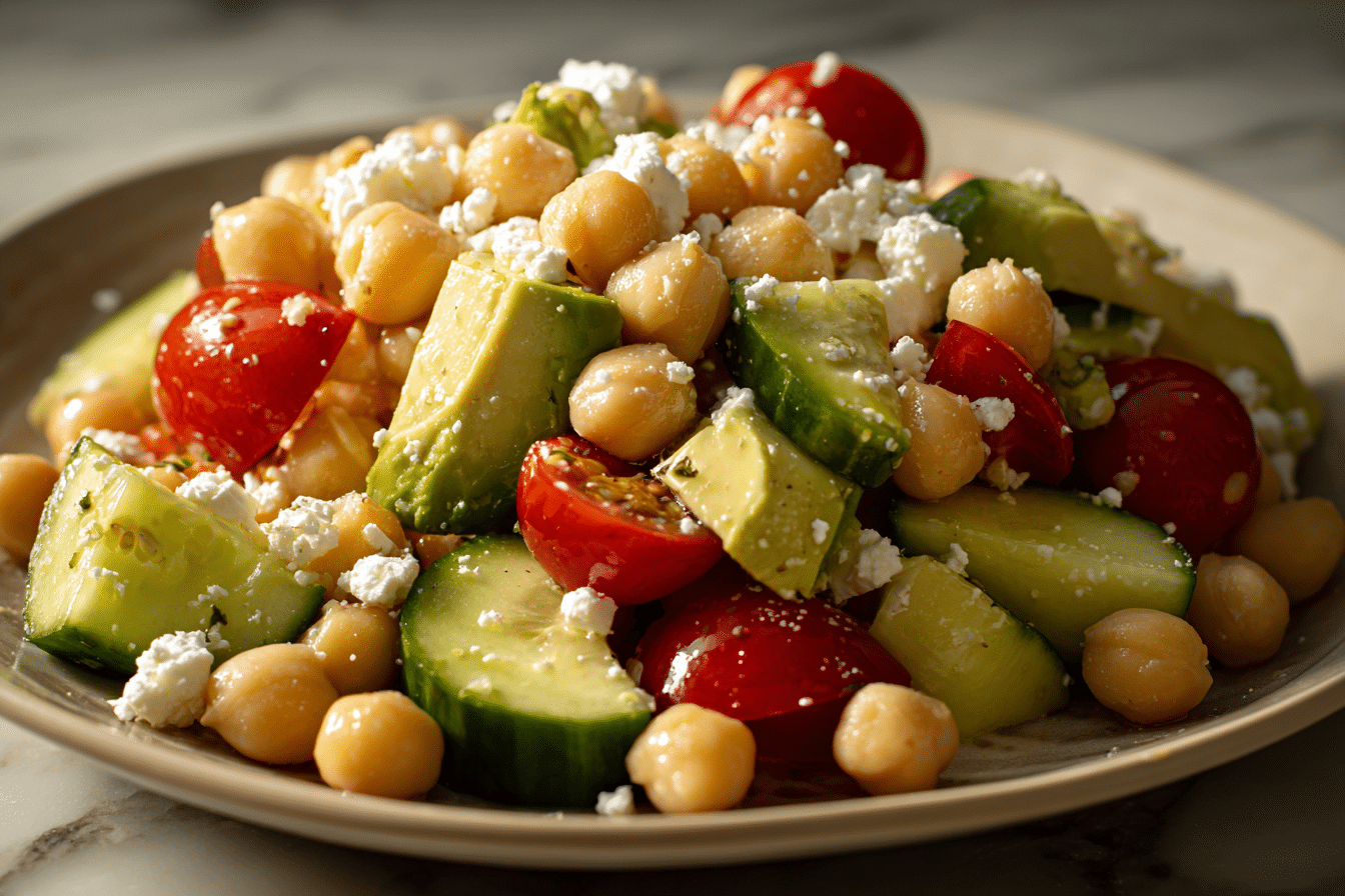 Chickpea Feta Avocado Salad offers a balanced mix of nutrients. Chickpeas provide plant-based protein and fiber, supporting a feeling of fullness and steady energy.