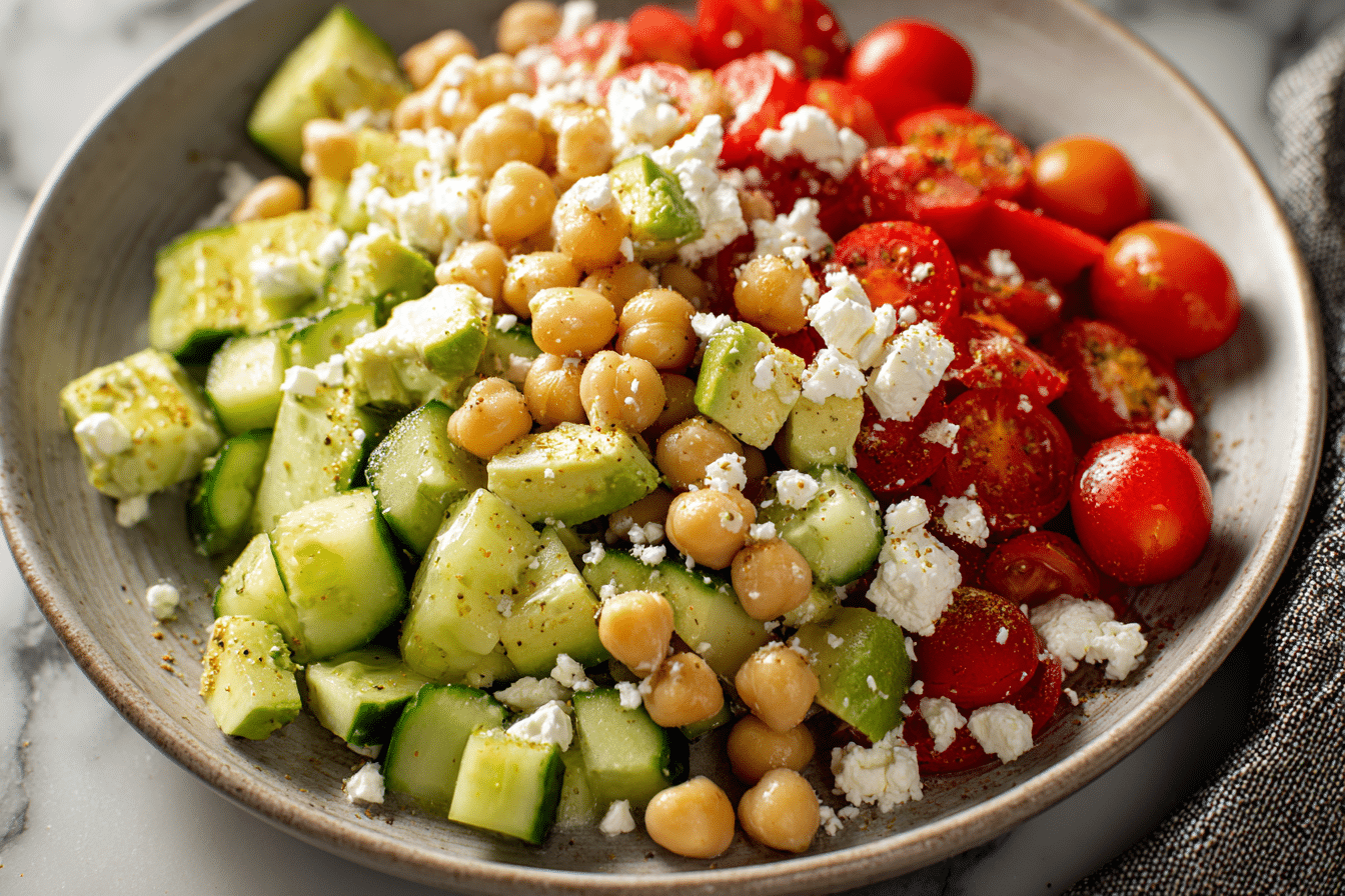 Each bite offers contrast, from the soft chickpeas to the smooth avocado and the slightly salty feta. Fresh vegetables and a zesty dressing bring everything together, creating a dish that works equally well as a quick lunch or a flavorful side.