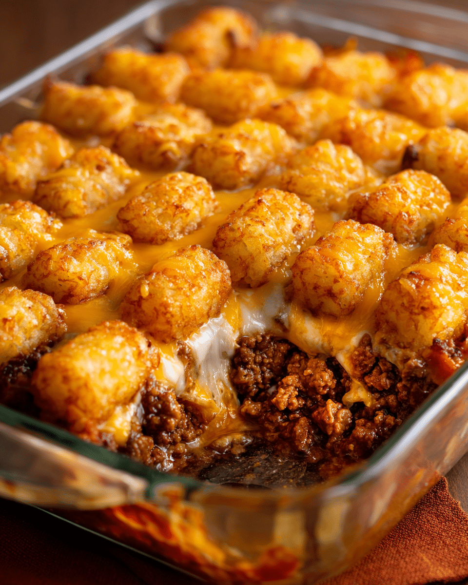 A hearty and flavorful casserole made with beef chili, melty cheese, and golden tater tots—perfect for family dinners or potluck nights.
