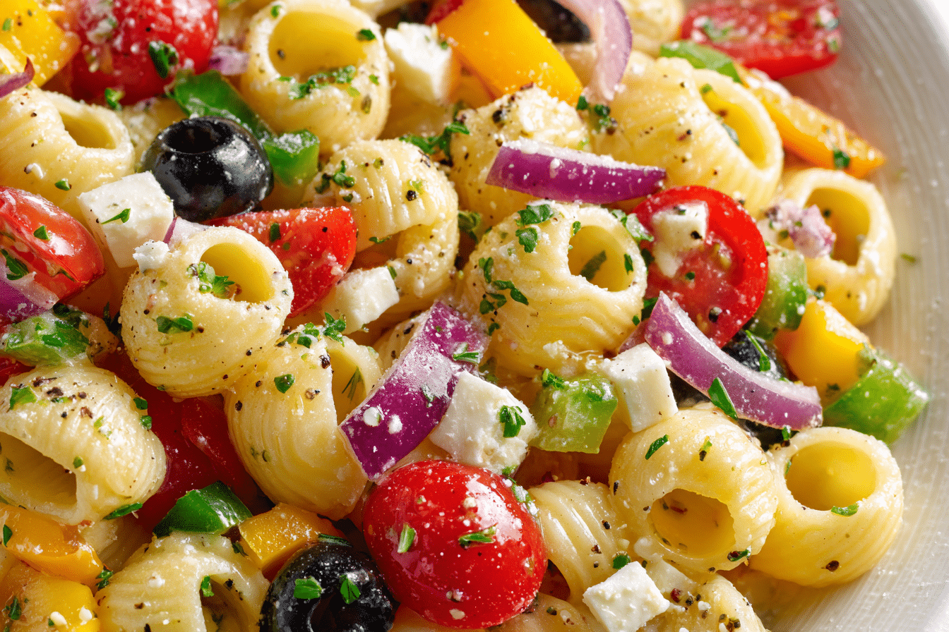 A fresh and colorful classic pasta salad with crisp vegetables, mozzarella, and a tangy Italian dressing.