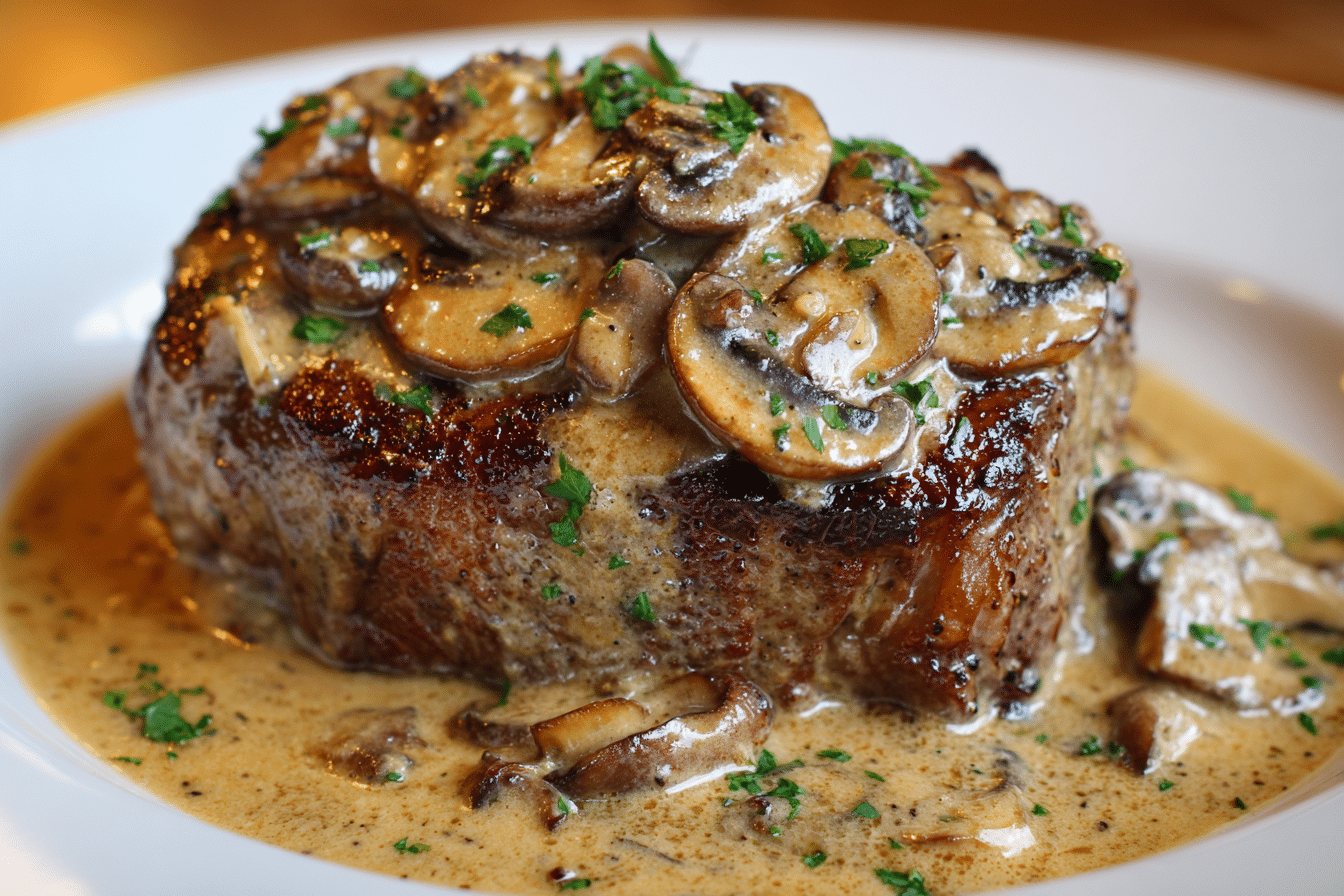 A classic restaurant-style dish with tender beef medallions smothered in a rich mushroom cream sauce infused with brandy, Dijon, and Worcestershire.