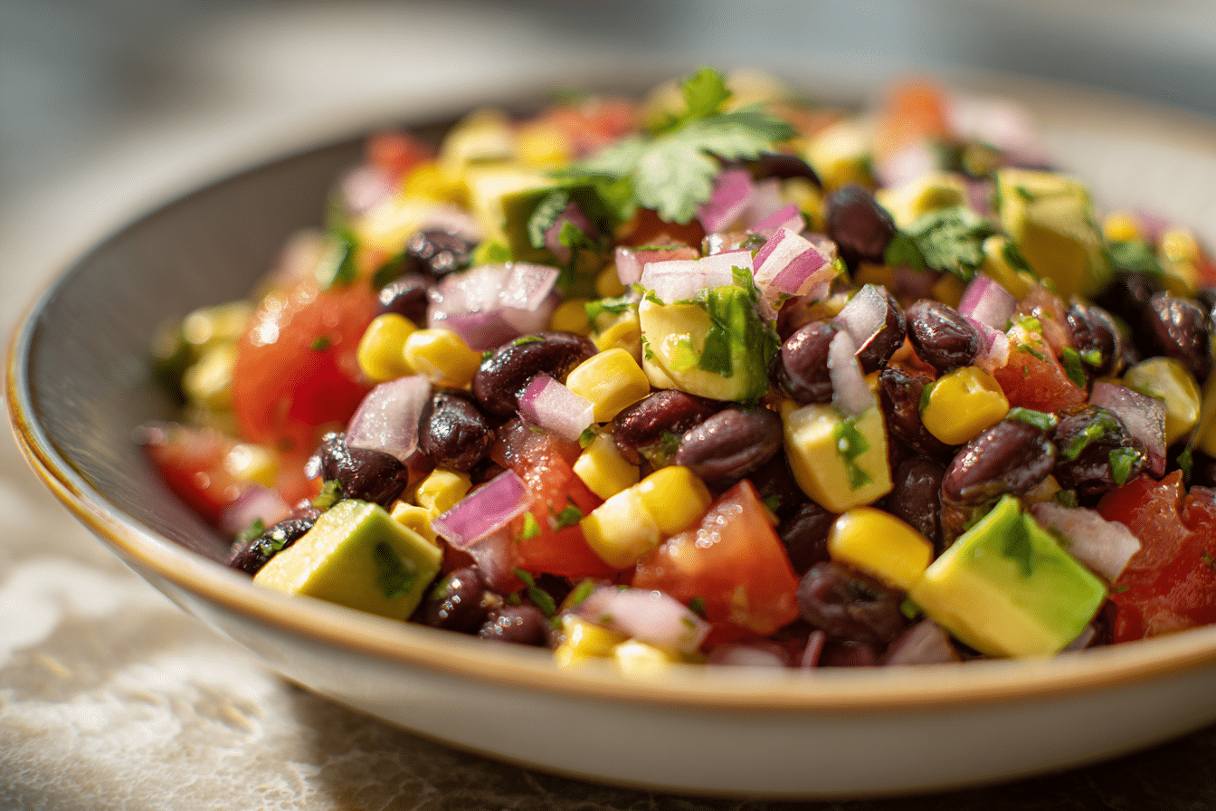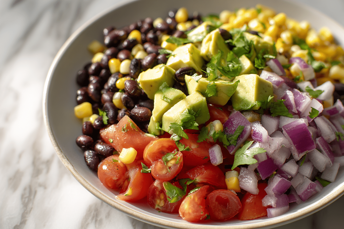 Red onion adds a sharp contrast that balances the sweetness of the corn and the richness of the beans. Avocado is often included for a creamy element that softens the overall texture and adds depth.
