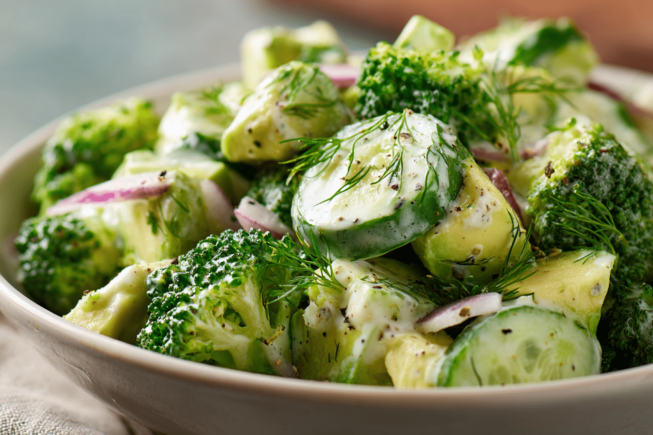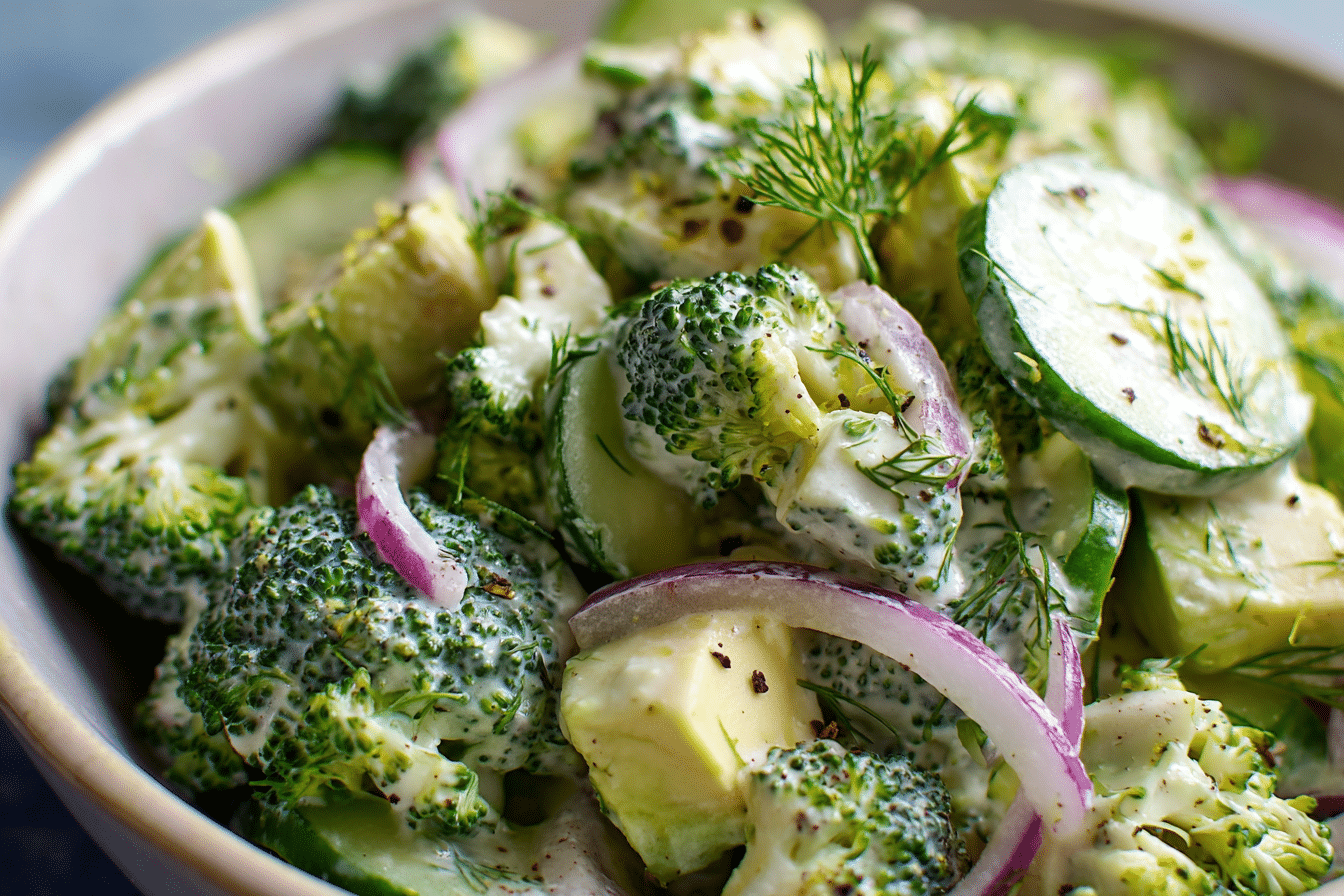 A creamy and refreshing salad made with cucumber, avocado, broccoli, and a light tangy dressing.