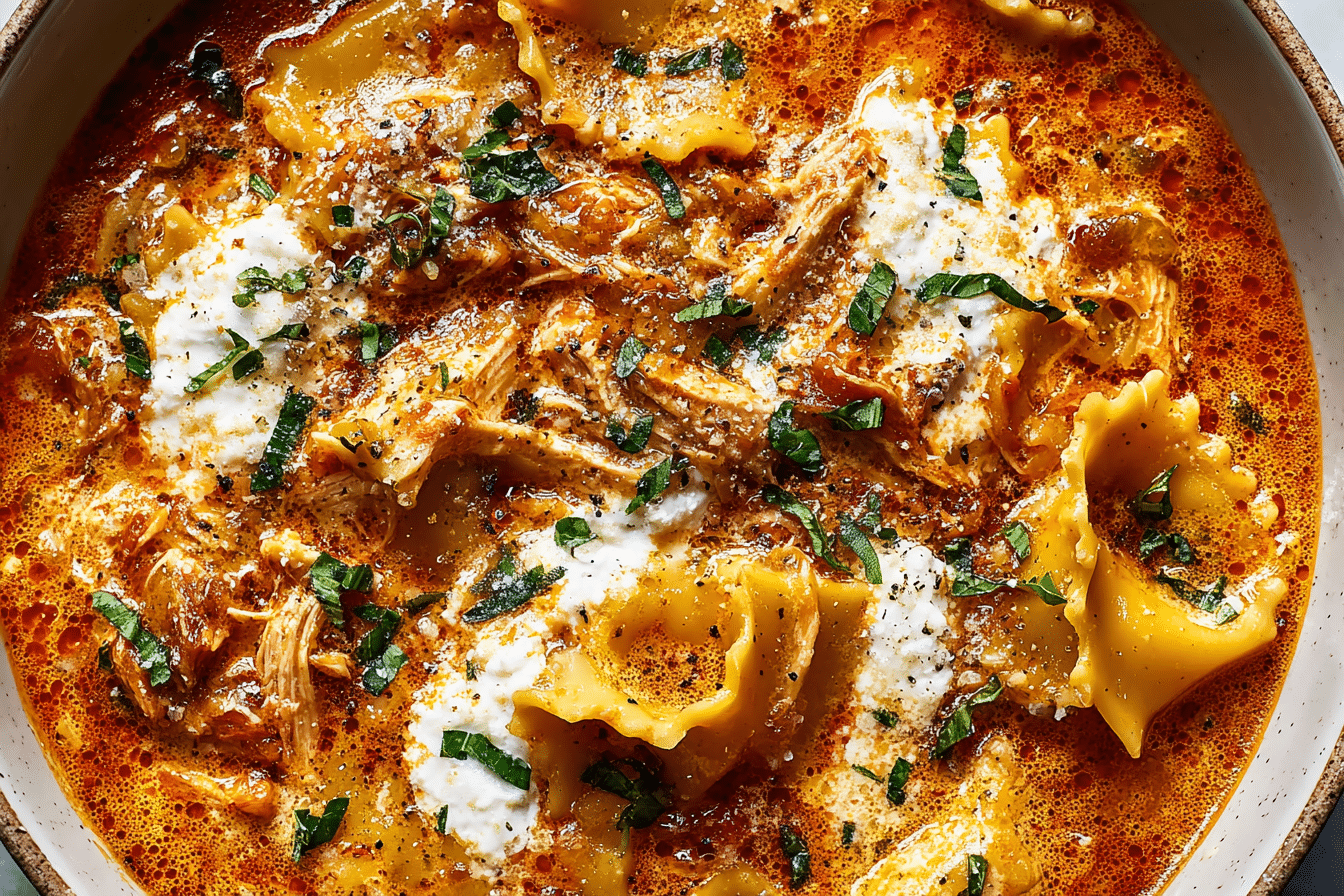 Forget layering pasta sheets or turning on the oven. This soup delivers everything you love about lasagna—minus the hassle. Instead, you’ll get shredded chicken, broken lasagna noodles, and a creamy tomato broth finished with dollops of cheese, all simmered to savory perfection.