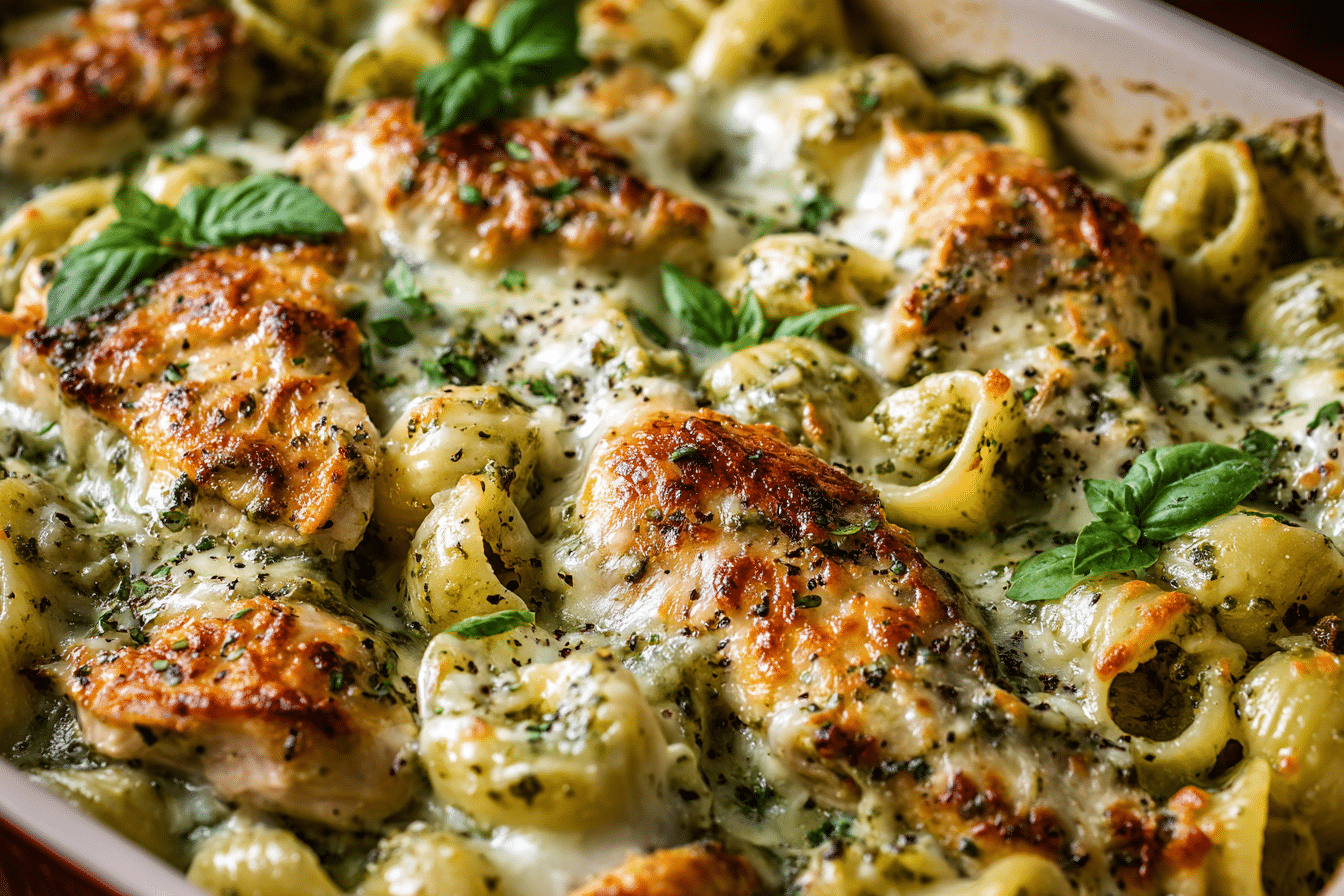 This easy recipe balances fresh herb flavor with creamy texture. The pesto adds brightness and depth, while the baked cheese forms a lightly crisp top that contrasts beautifully with the soft pasta beneath. Every forkful offers savory chicken, silky sauce, and just the right amount of richness.