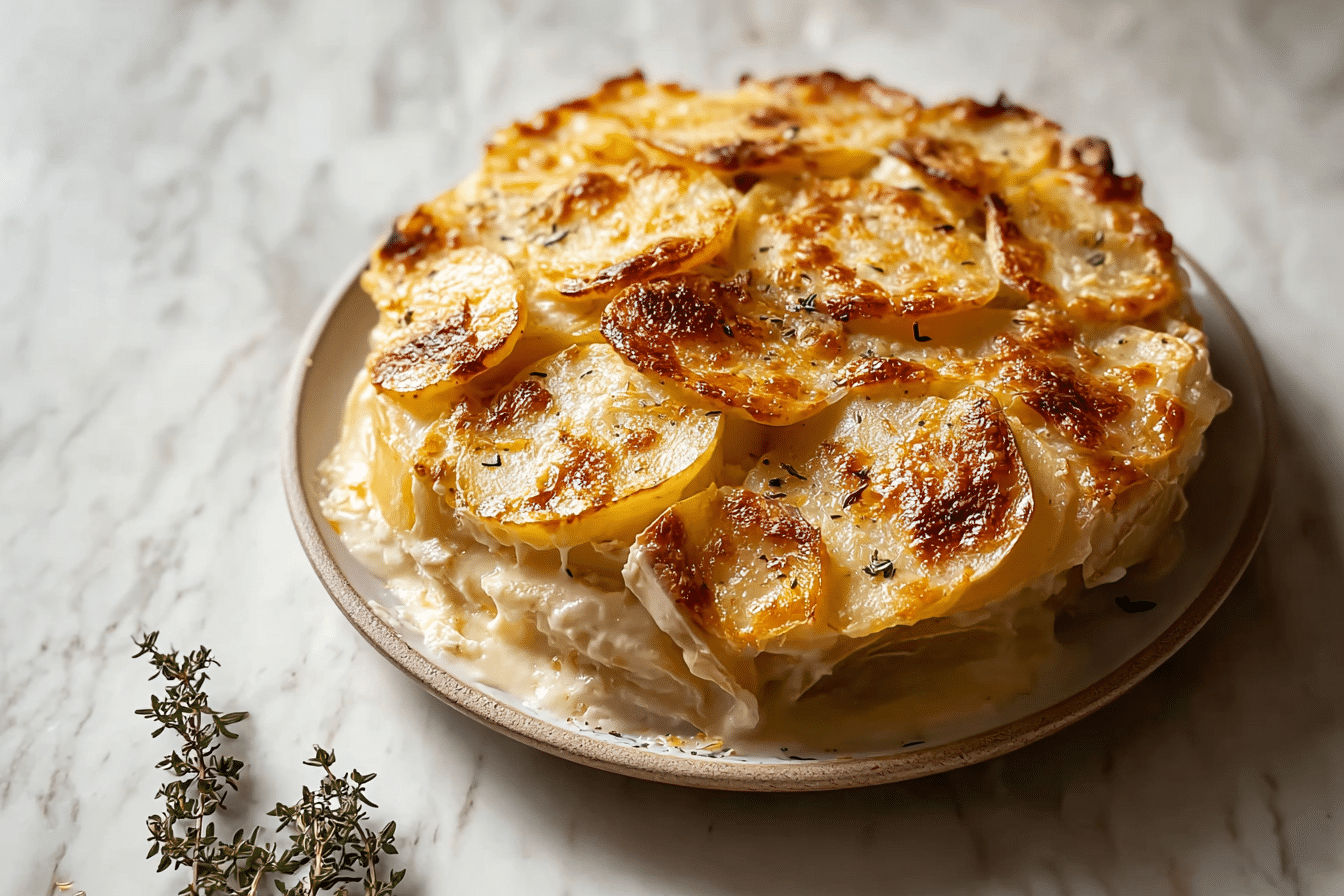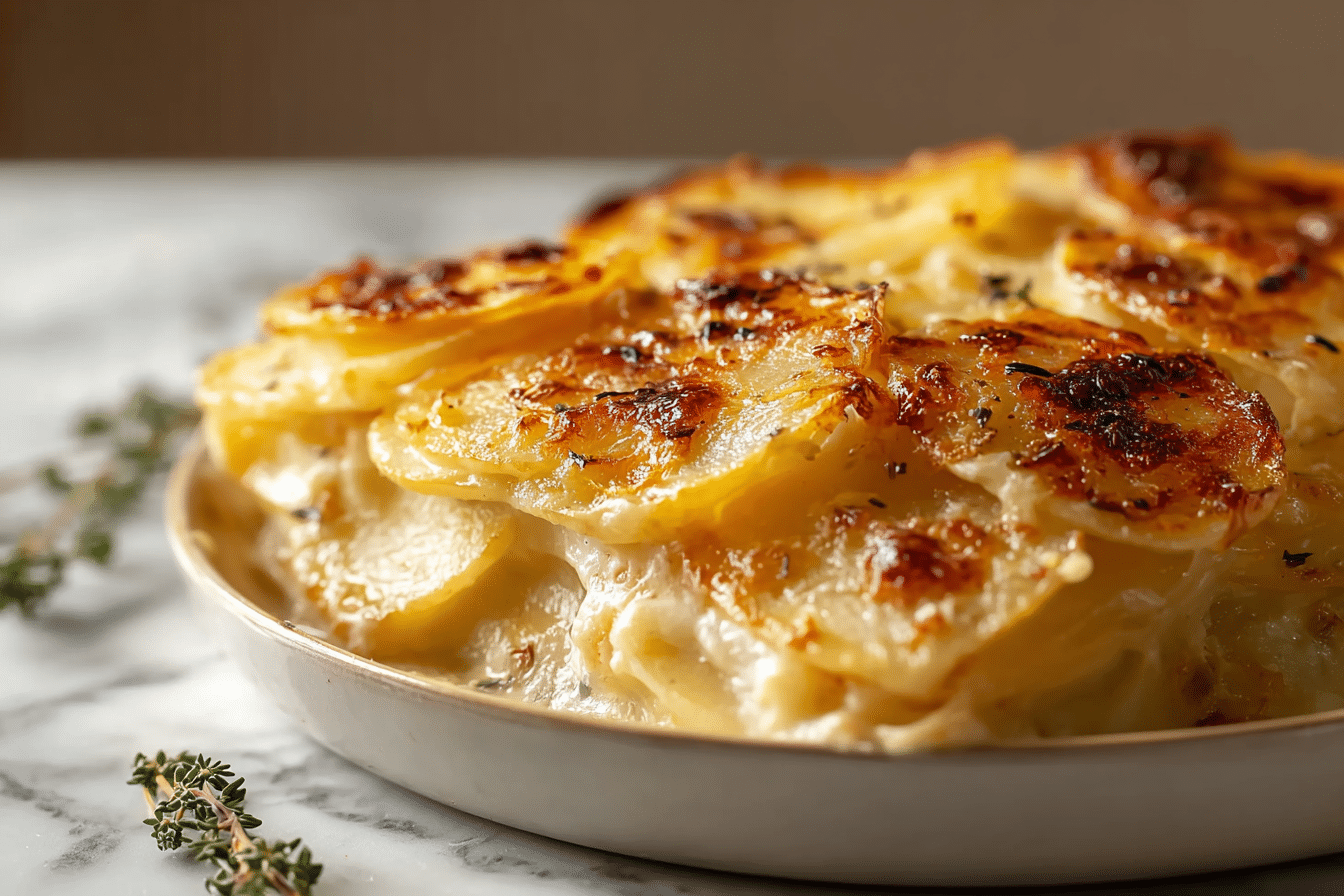 Heavy cream and milk form the base of the sauce. The cream provides richness, while the milk lightens the texture so the dish does not feel too heavy. This combination creates a smooth consistency that coats each layer of potatoes.