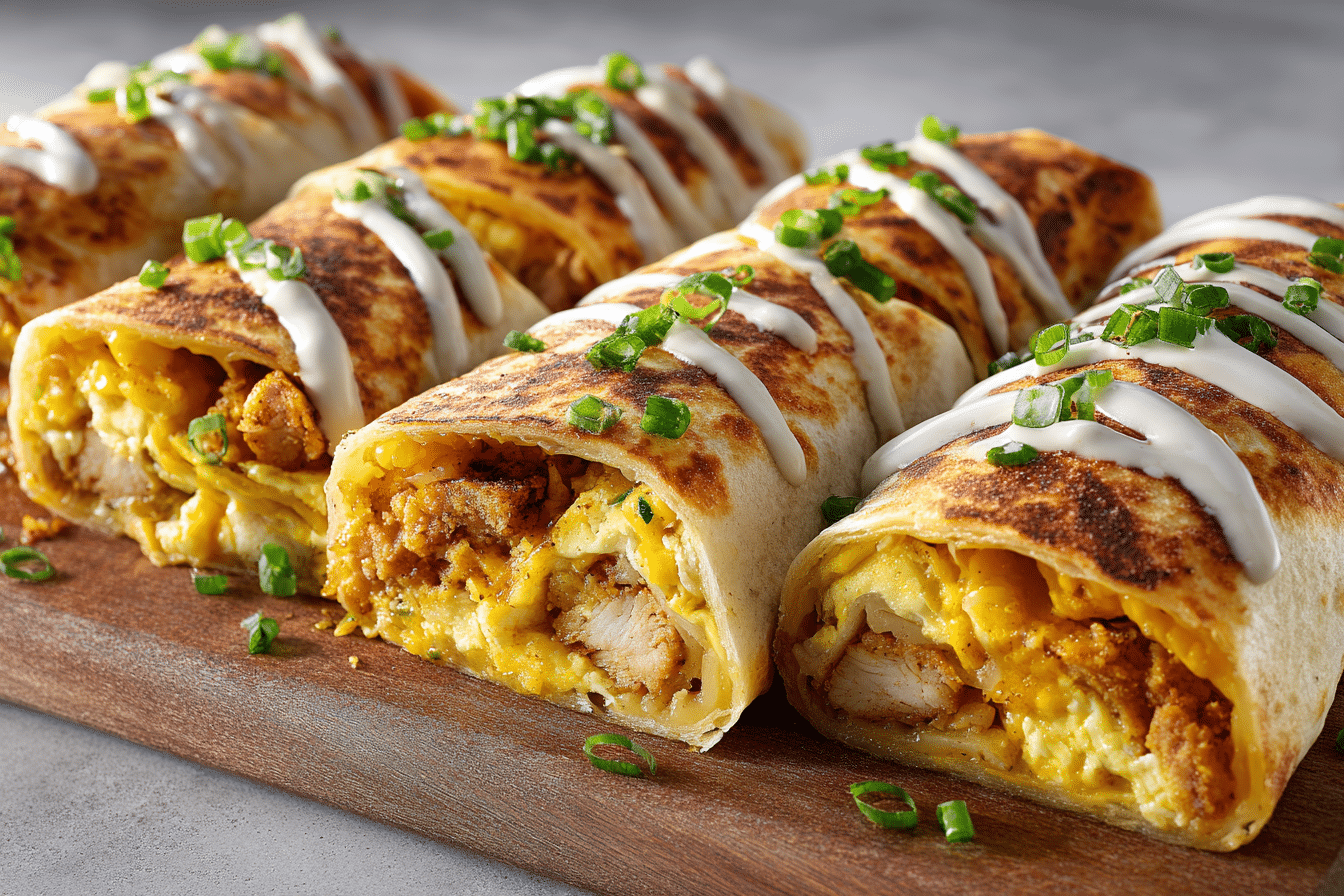 A hearty, crispy breakfast wrap filled with golden chicken, creamy scrambled eggs, crispy hash browns, cheese, and a flavorful sauce, all toasted to perfection inside a warm tortilla.