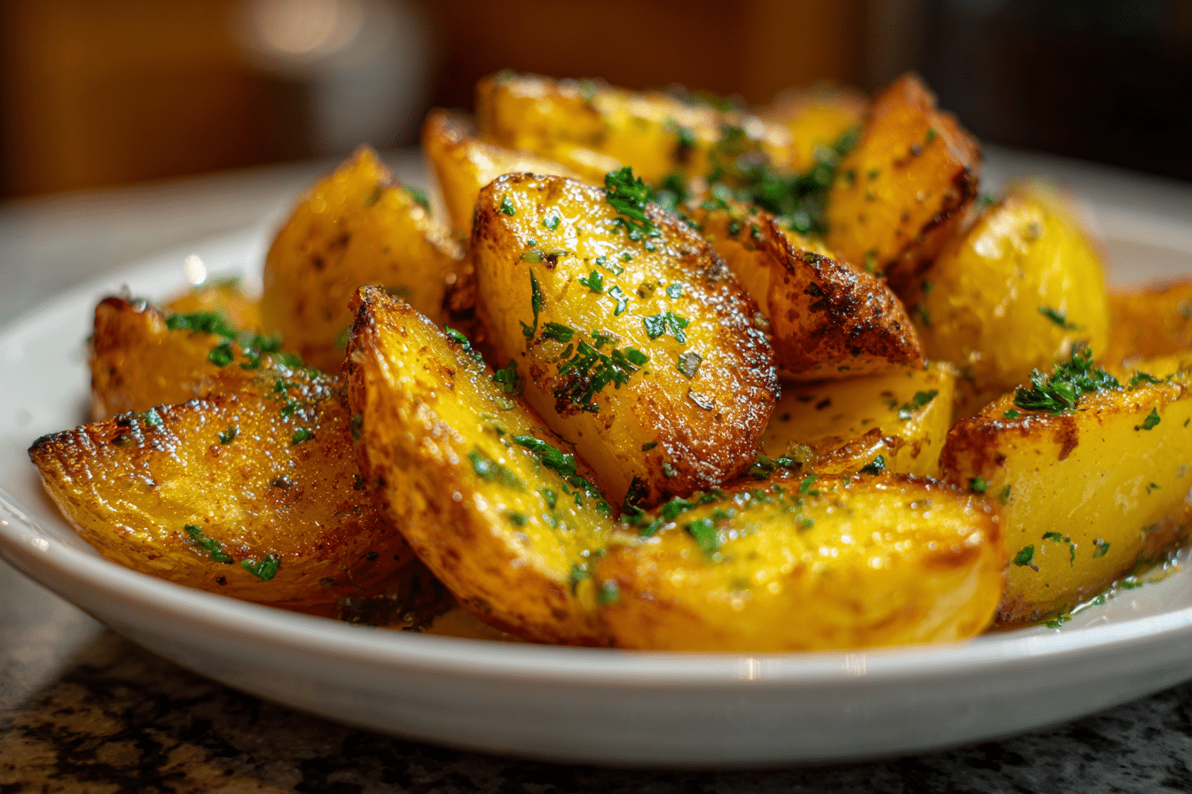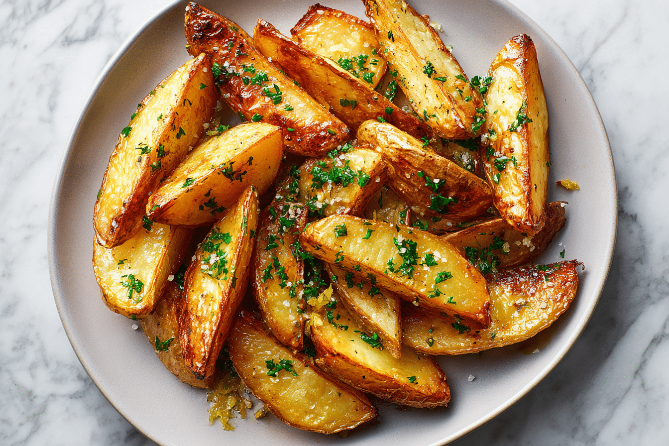Golden roasted Greek-style potatoes infused with lemon, garlic, and herbs, featuring crispy edges and tender centers.