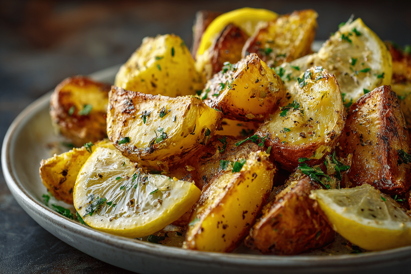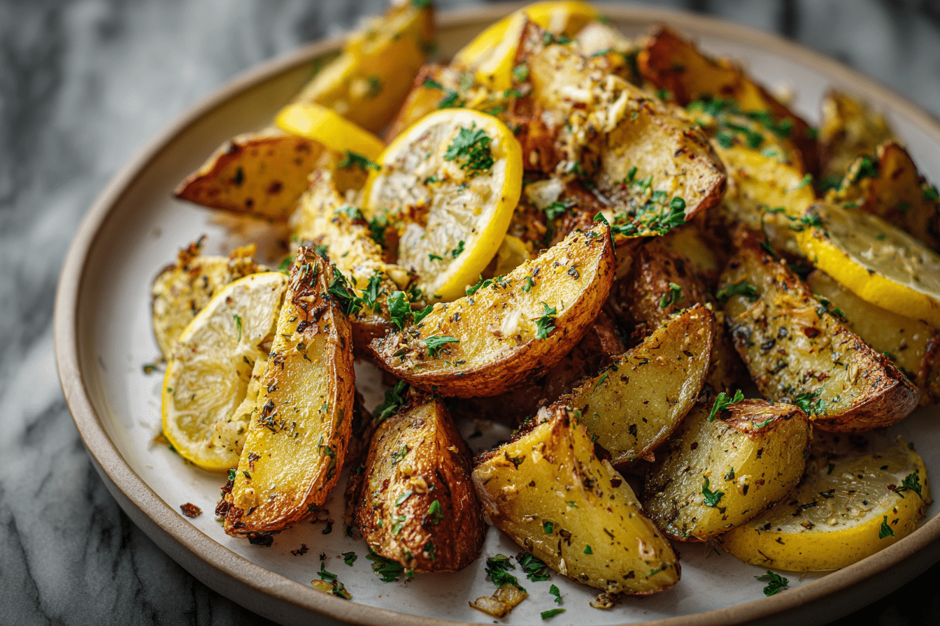 Crispy Greek Potatoes With Lemon Flavor are oven-roasted wedges infused with garlic, herbs, and lemon for a tender inside and crisp golden edges.