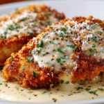 Crispy parmesan-crusted chicken served in a creamy garlic sauce — perfect for an easy yet indulgent dinner.