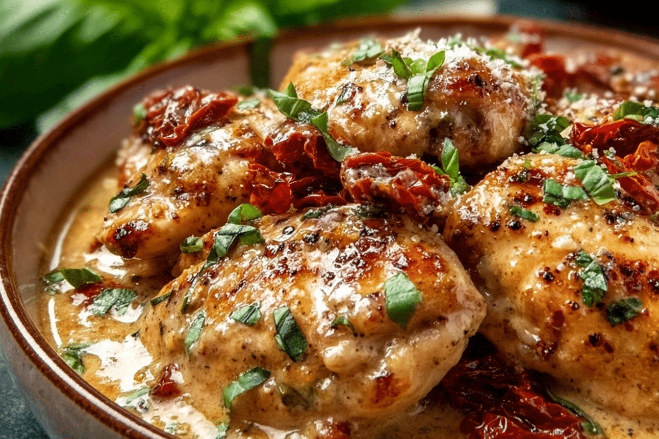 Tender chicken slow cooked in a creamy garlic parmesan sauce with sun-dried tomatoes and herbs.