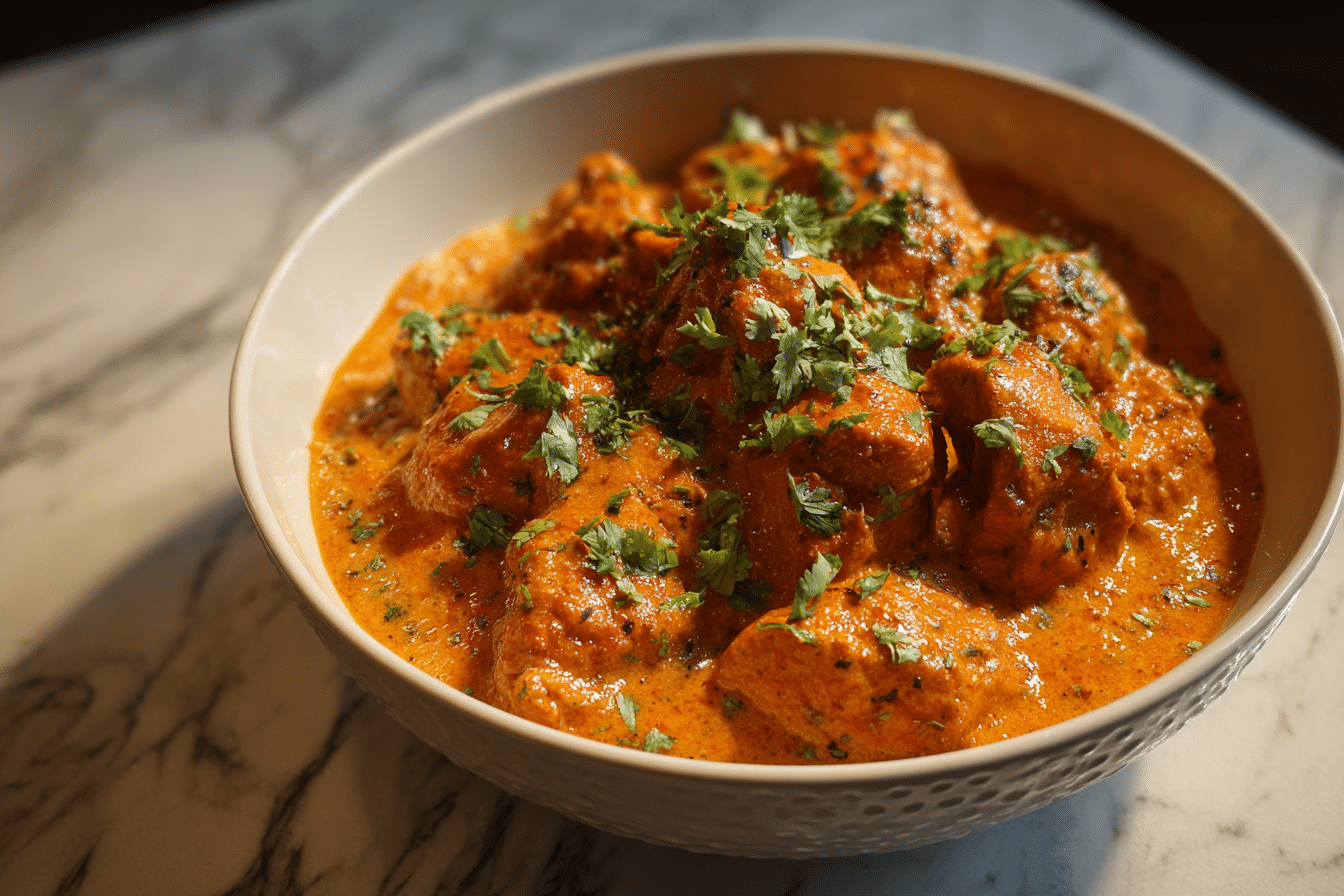 Heavy cream is added toward the end of cooking, giving the sauce its creamy consistency. It softens the spices and creates a balanced finish.