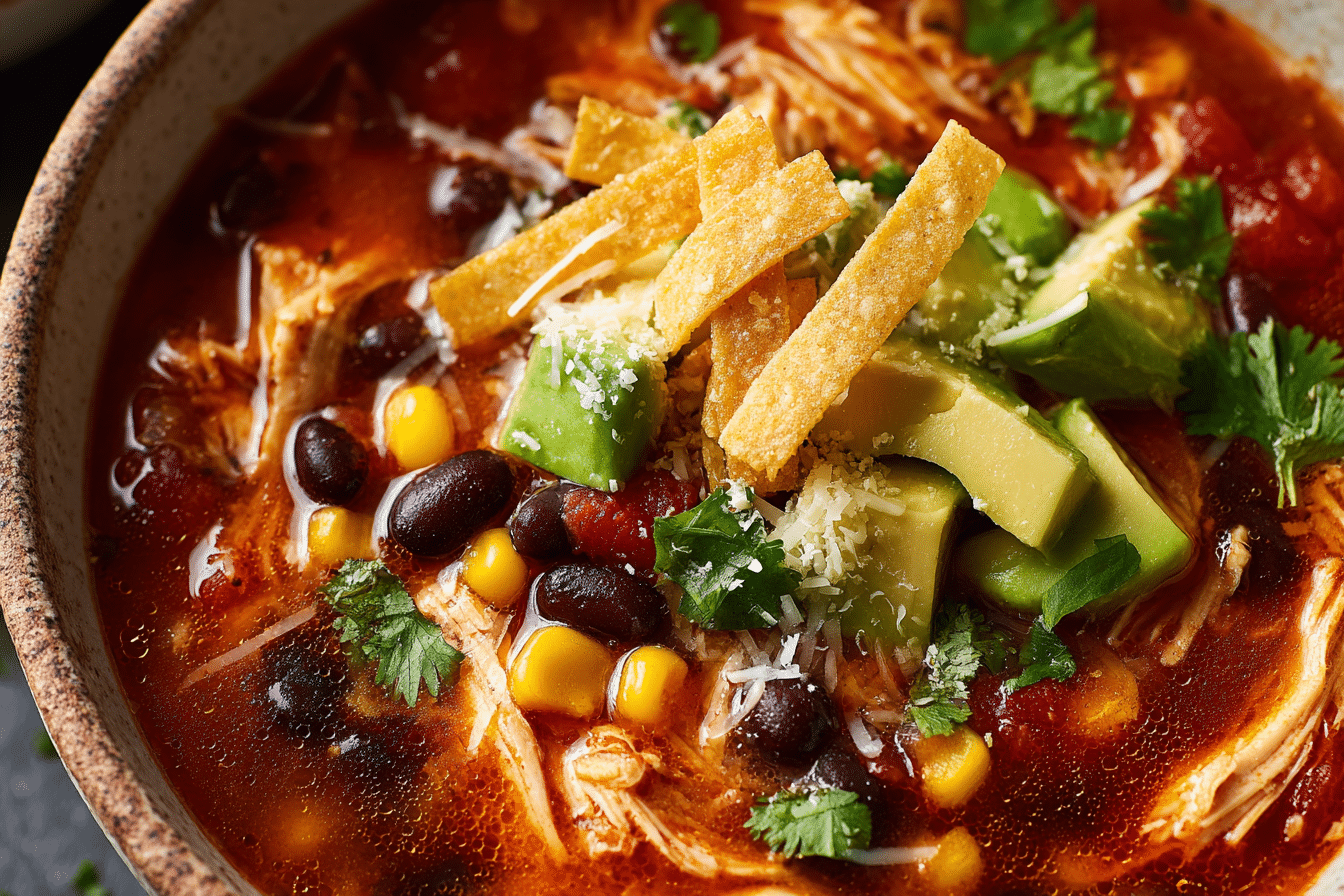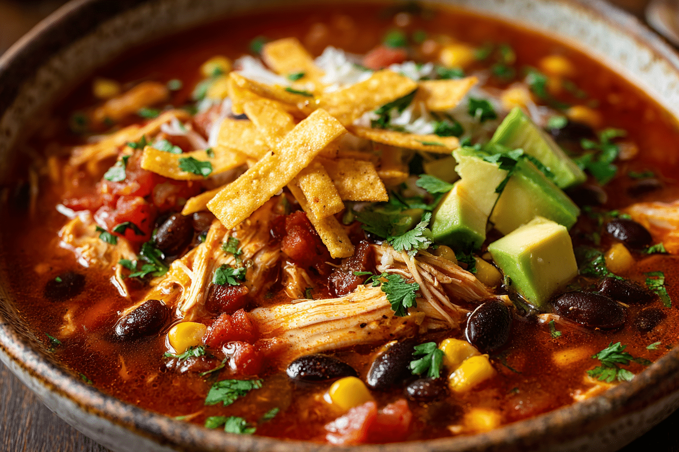Crockpot Chicken Tortilla Soup uses a combination of protein, vegetables, and spices that create a balanced and flavorful broth.