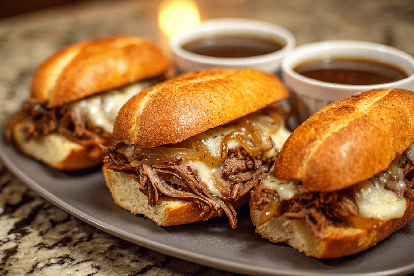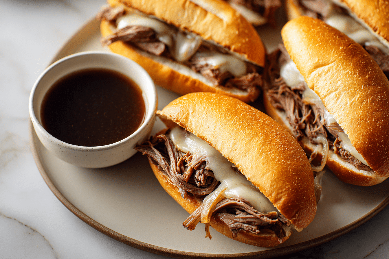 They also work well for meal prep. The shredded beef can be stored separately and reheated with the au jus, making it easy to assemble fresh sandwiches throughout the week.