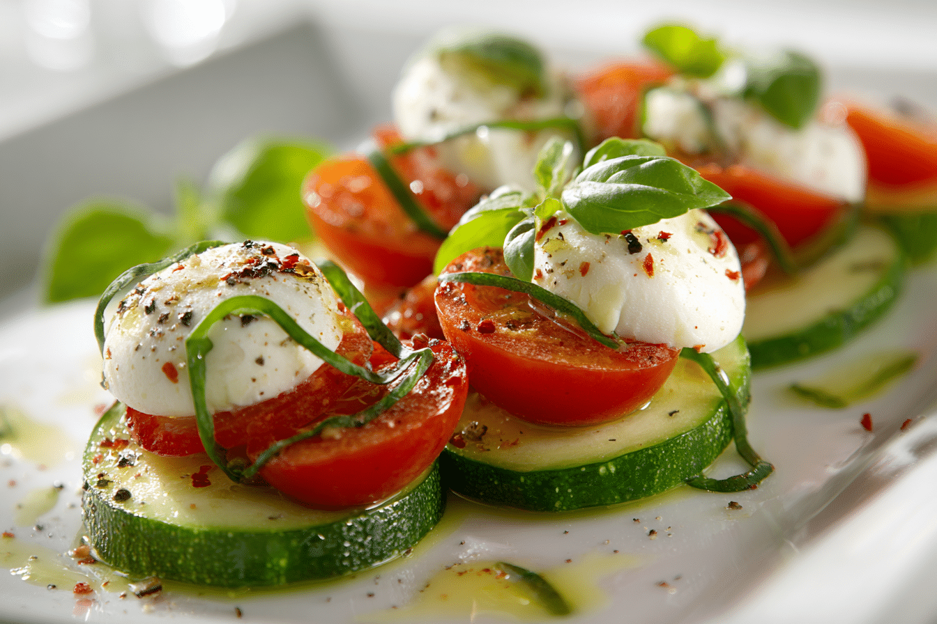 Cucumber Caprese Salad offers a balanced combination of vegetables, healthy fats, and protein from mozzarella cheese. Cucumbers contain high water content, contributing hydration and a refreshing texture.