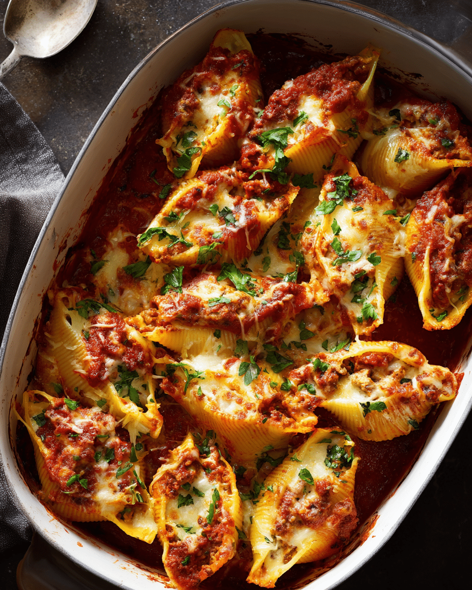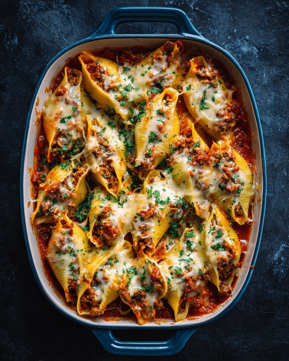 This recipe delivers maximum flavor with minimal fuss. The jumbo shells hold a hearty beef and cheese filling that bakes until bubbly and golden, making each bite warm, savory, and satisfying. It’s freezer-friendly, kid-approved, and endlessly customizable.