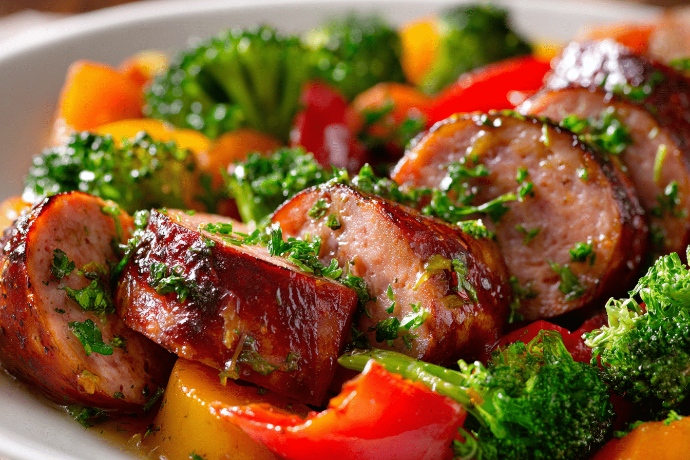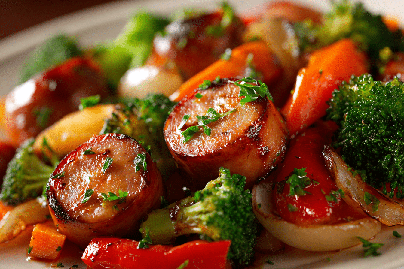 Kielbasa sausage provides a rich, savory base while roasted vegetables add color, texture, and balance. As the ingredients cook together in the oven, the honey garlic sauce lightly coats everything, creating caramelized edges and deep flavor.