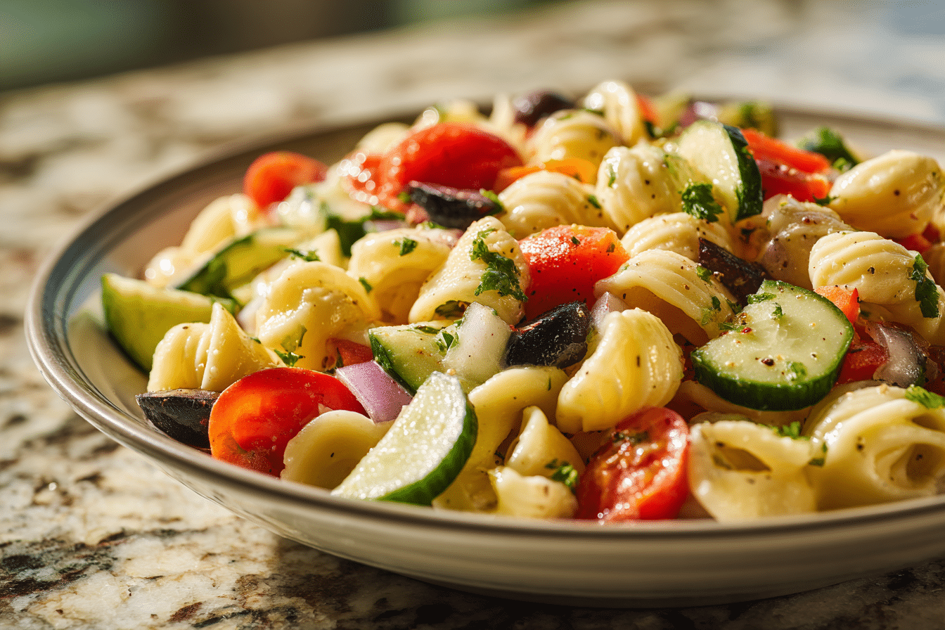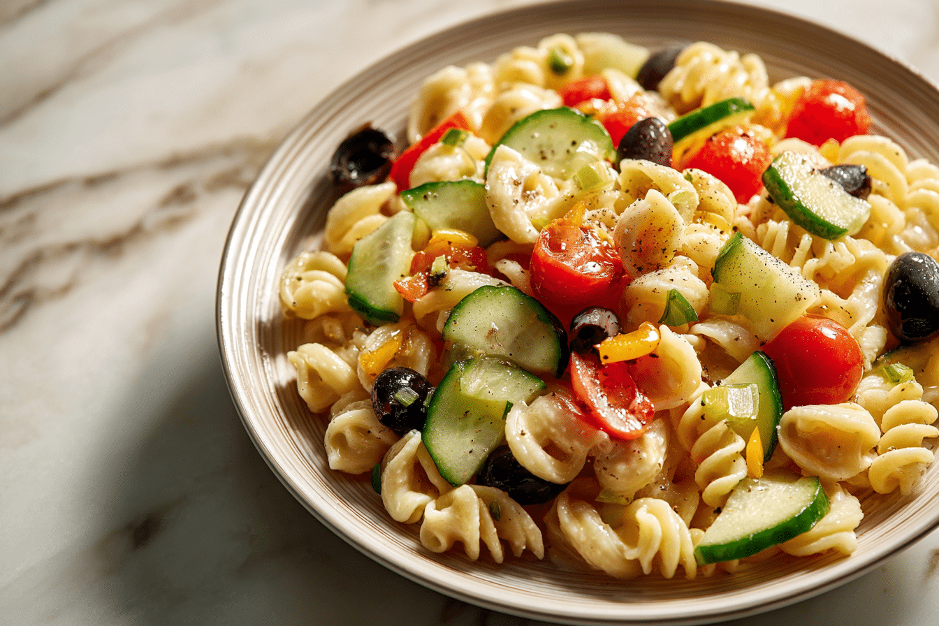 This pasta salad combines tender pasta with crisp vegetables and a light, tangy dressing that coats every bite. It’s flexible enough to adjust based on what you have available, making it a reliable option for quick meals, gatherings, or meal prep.