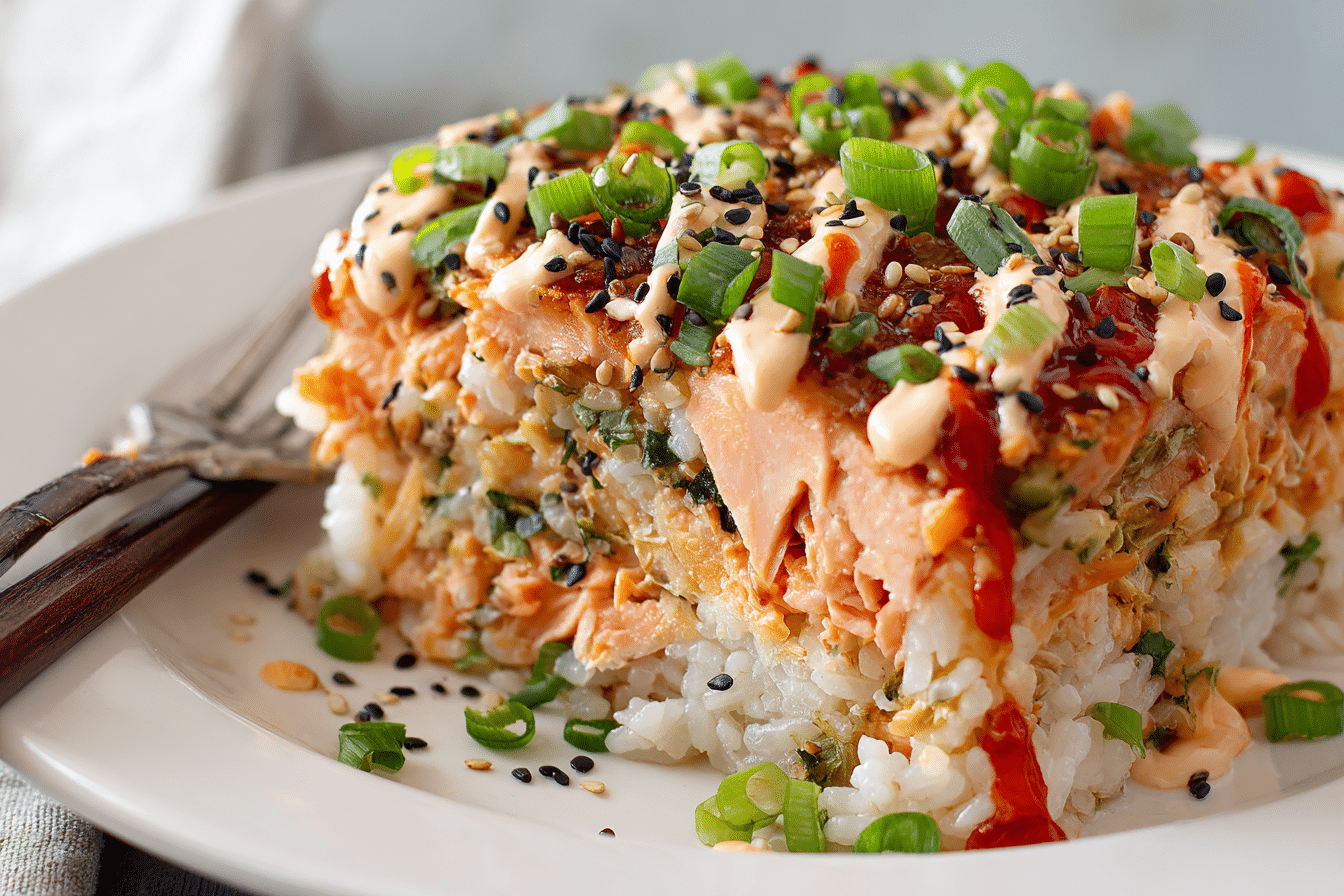 Each bite combines tender seasoned rice, rich salmon, creamy sauce, and a gentle kick of heat. The contrast between fluffy rice and savory topping creates a layered texture that feels hearty yet balanced. It brings the familiar taste of sushi into a format that is easy to prepare at home.