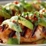 Fiesta Lime Chicken with Avocado is a bright grilled chicken dish filled with bold citrus flavor, warm spices, and creamy avocado. The chicken marinates in lime juice, garlic, and spices before grilling, creating a juicy texture and vibrant flavor.