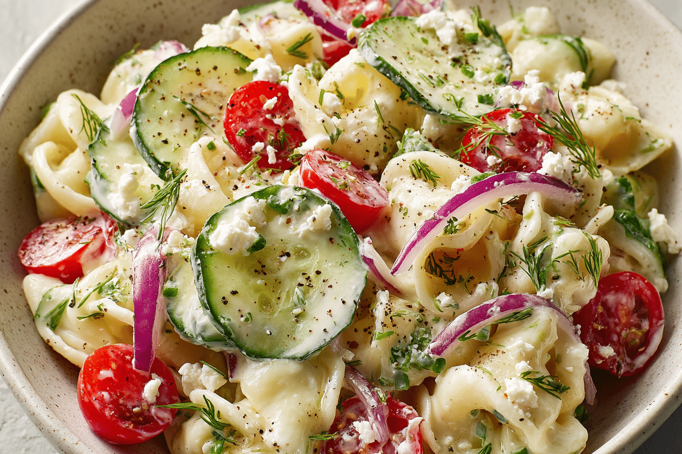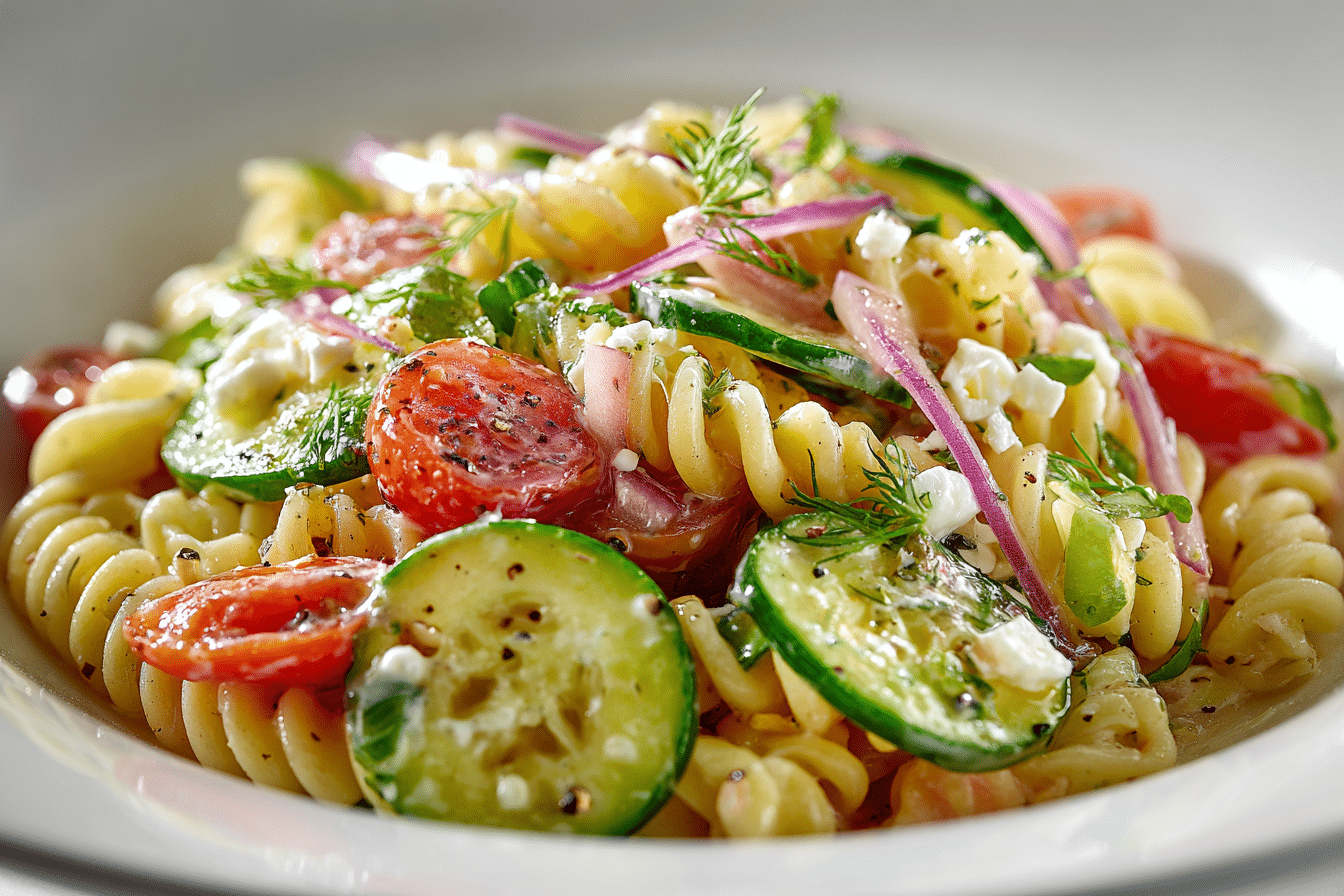 A refreshing cucumber pasta salad with a creamy dressing, fresh herbs, and crisp vegetables.