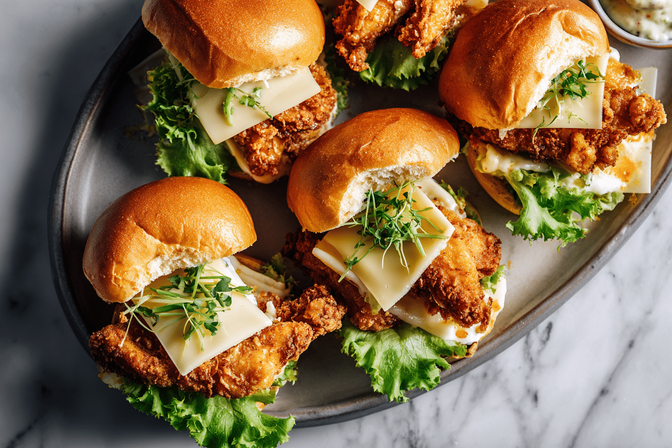 What makes this recipe especially appealing is how everything comes together in layers of flavor. The chicken is seasoned and fried until golden and crisp, then tucked into soft buns with gooey cheese that melts slightly from the heat. Each bite delivers a balance of savory, creamy, and slightly crunchy elements.