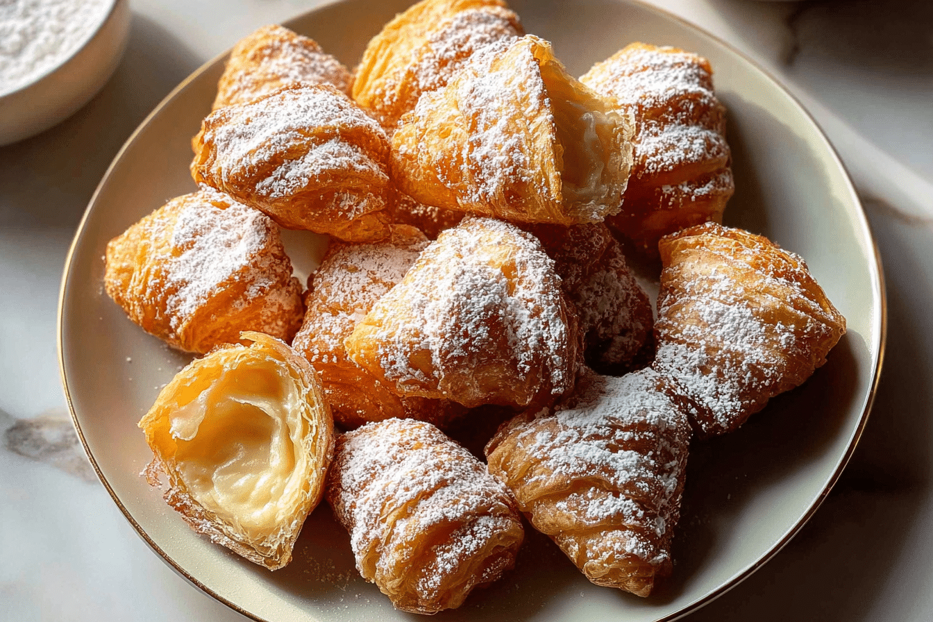 Fried Croissant Beignets are crispy, buttery pastry bites made from croissant dough and finished with powdered sugar.