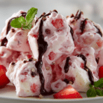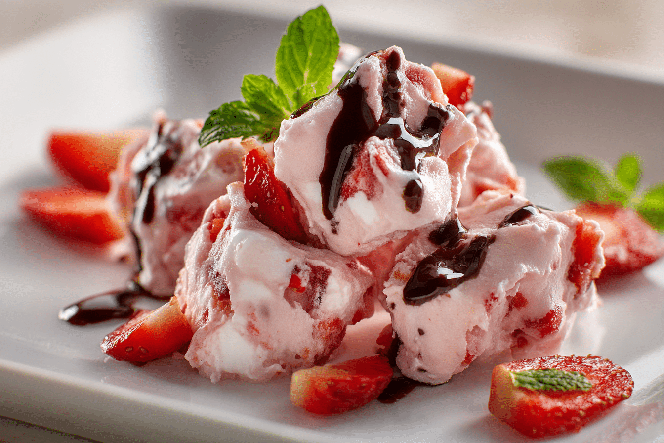 The Frozen Strawberry Yogurt Clusters recipe uses a handful of basic ingredients and a straightforward process. Fresh strawberries are chopped and mixed with thick yogurt, lightly sweetened, and then portioned into small clusters before freezing. Once solid, the clusters are dipped in melted chocolate and returned to the freezer until firm.