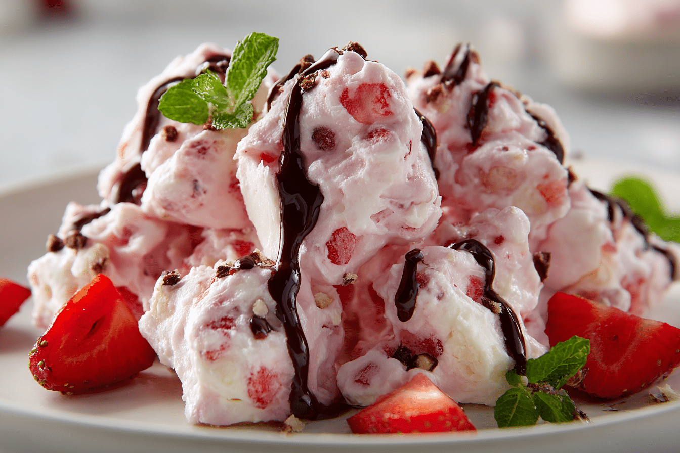 At gatherings, these clusters can appear on dessert trays where guests can pick up small frozen bites. Their pink color and chocolate drizzle make them visually appealing.