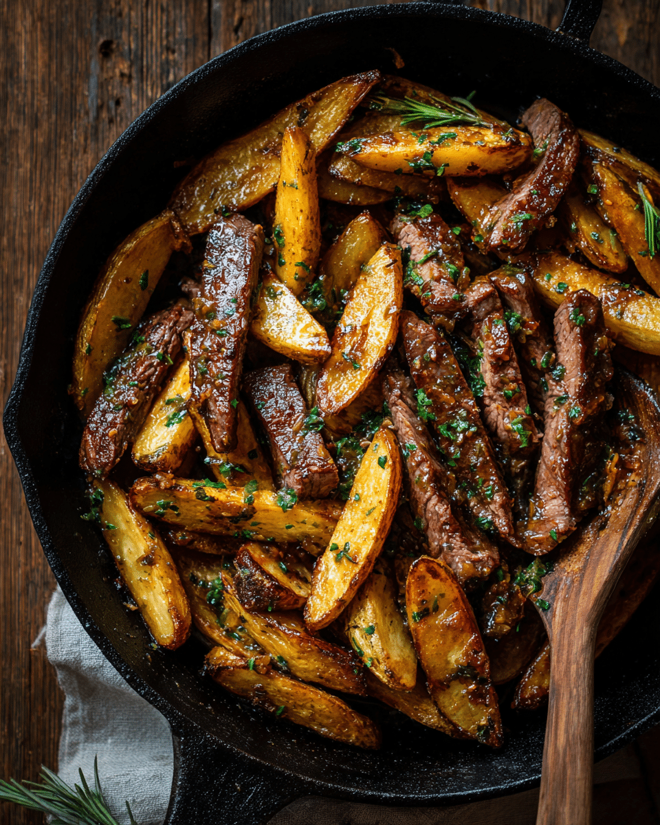 The final result is crispy-edged potatoes, tender steak bites, and a glossy herb-butter coating that clings to every surface.