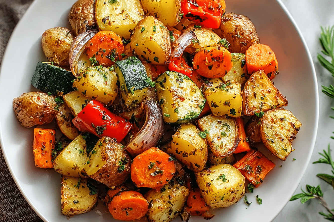 Garlic Herb Roasted Potatoes and Veggies is a simple oven-roasted dish with crispy potatoes and tender vegetables coated in garlic and herbs.