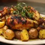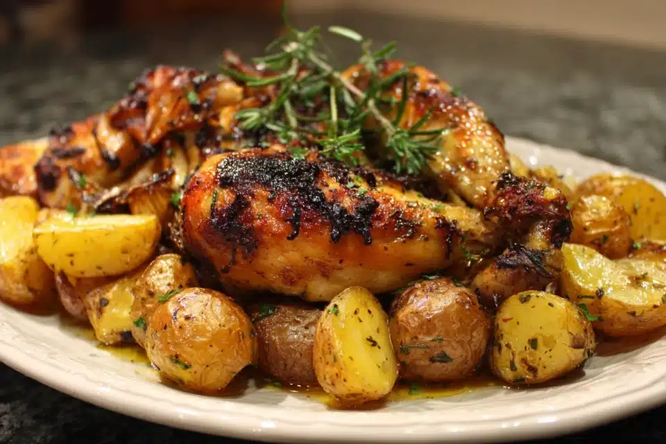 • Pour the garlic butter mixture evenly over the chicken and potatoes.