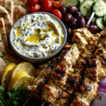 Greek Chicken Souvlaki Grazing Board with Feta Dip brings the vibrant flavors of Mediterranean cooking into a colorful, shareable meal. Tender chicken souvlaki skewers seasoned with lemon, garlic, and herbs sit at the center of a grazing board filled with fresh vegetables, warm pita, olives, and creamy feta dip.