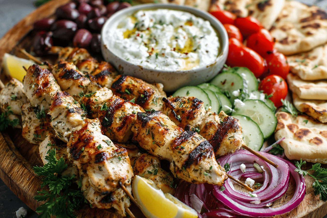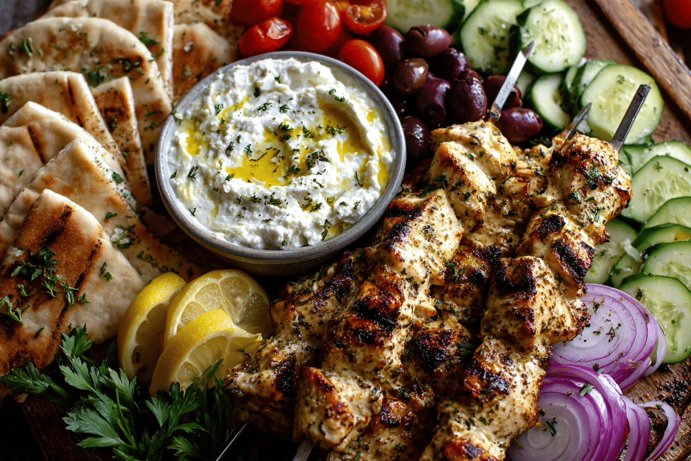 A Mediterranean grazing board featuring grilled chicken souvlaki, creamy feta dip, fresh vegetables, olives, and warm pita.