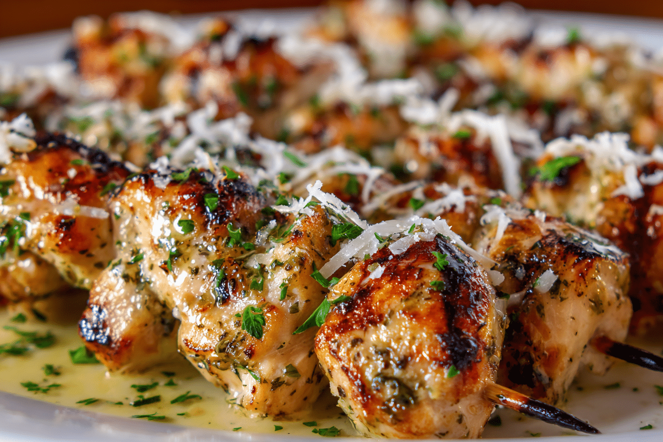 Grilled Ranch Garlic Parmesan Chicken Skewers bring together savory herbs, smoky grill flavor, and tender chicken in a simple yet satisfying dish. Each skewer holds juicy pieces of chicken coated in a flavorful ranch-inspired marinade infused with garlic and finished with Parmesan. As the skewers cook over the grill, the marinade caramelizes slightly, creating a lightly crisp exterior while the inside remains moist.