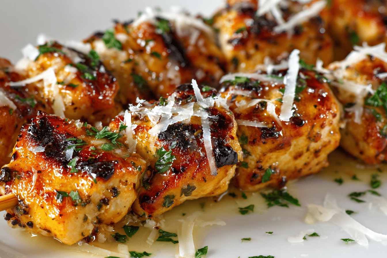 Grilled Ranch Garlic Parmesan Chicken Skewers feature tender chicken cubes marinated in ranch seasoning, garlic, and olive oil, then grilled and finished with savory Parmesan cheese.