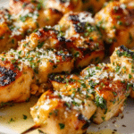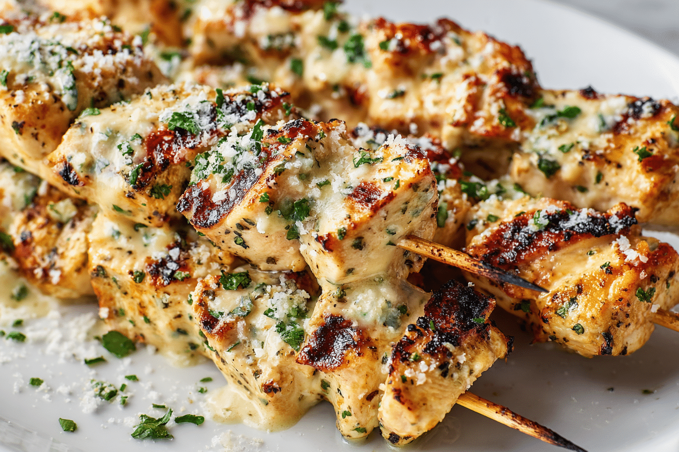 Juicy grilled chicken skewers coated in ranch, garlic, and Parmesan seasoning with lightly charred edges and savory flavor.