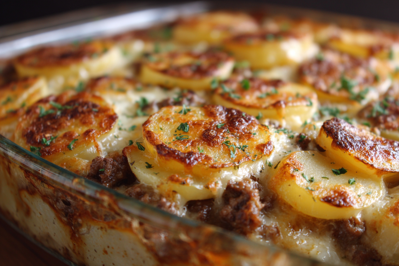 A cozy, family-friendly casserole with layers of thinly sliced potatoes, savory ground beef, creamy sauce, and melted cheddar cheese.
